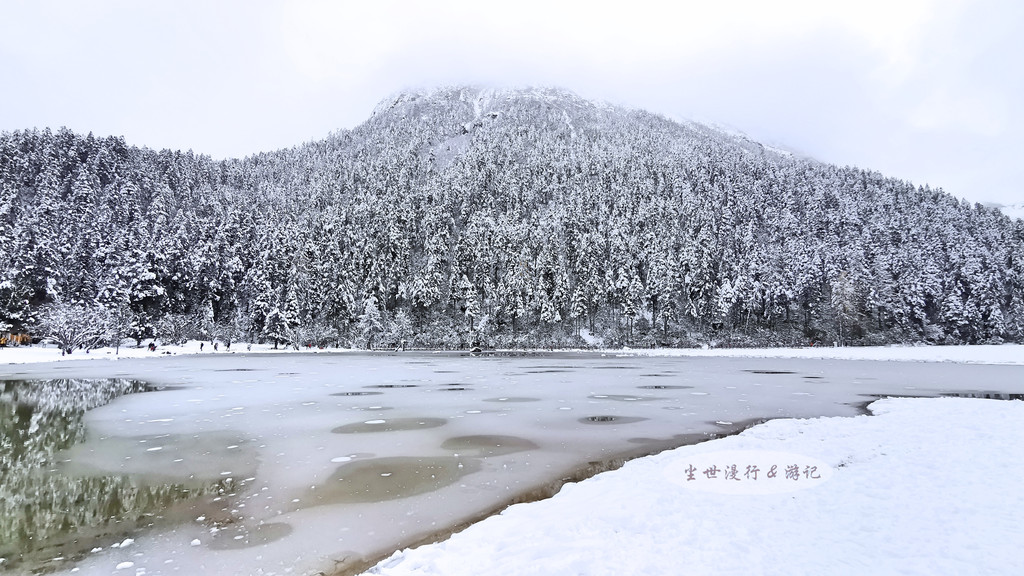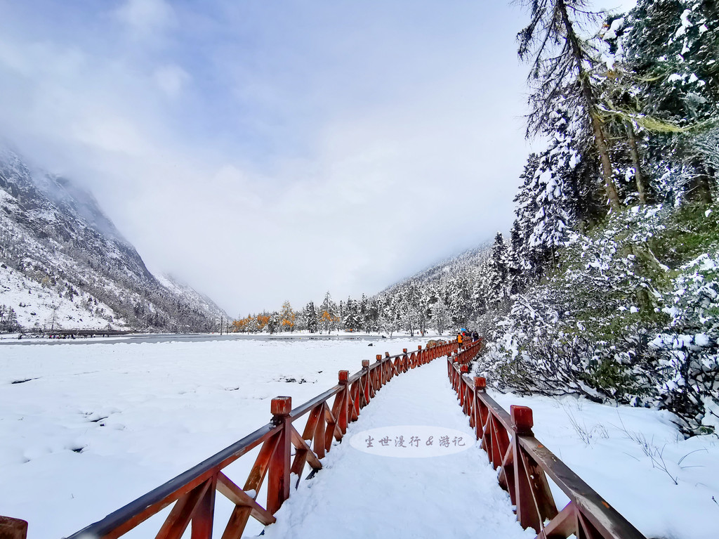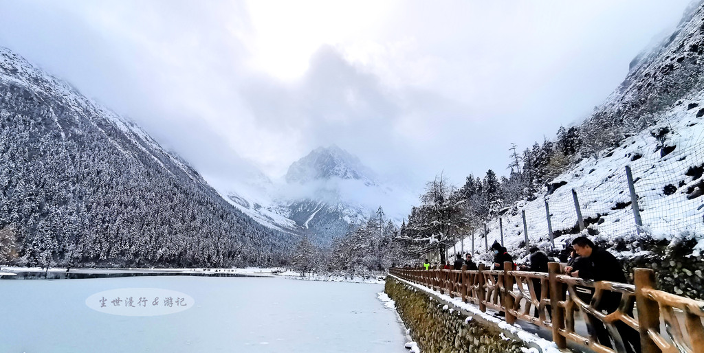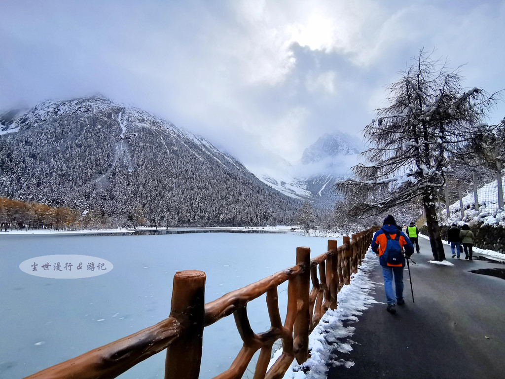 磐羊湖的沿岸建有一条长长的环湖栈道。顺着游步道往前走,就能看见被雪山和雪林环抱着的磐羊湖了。