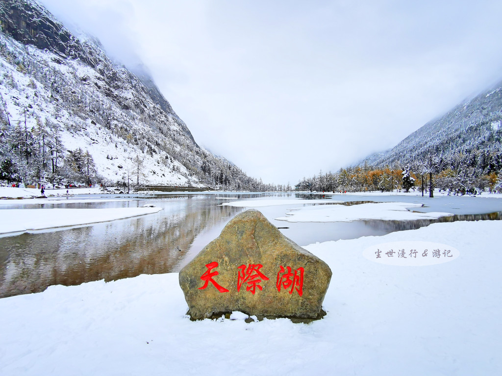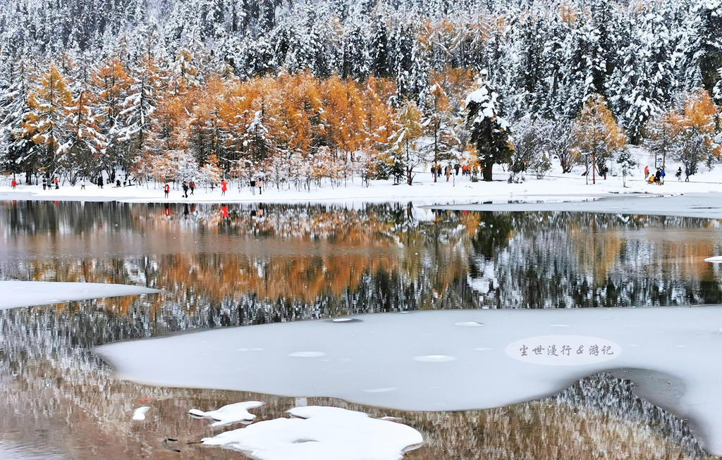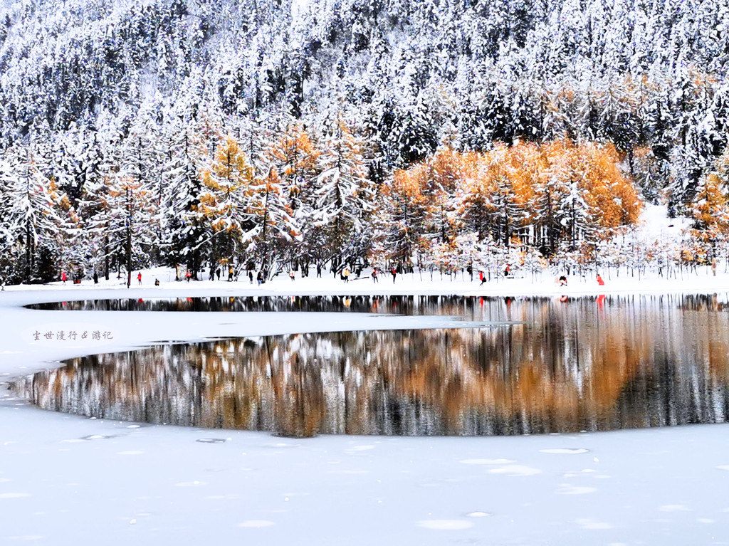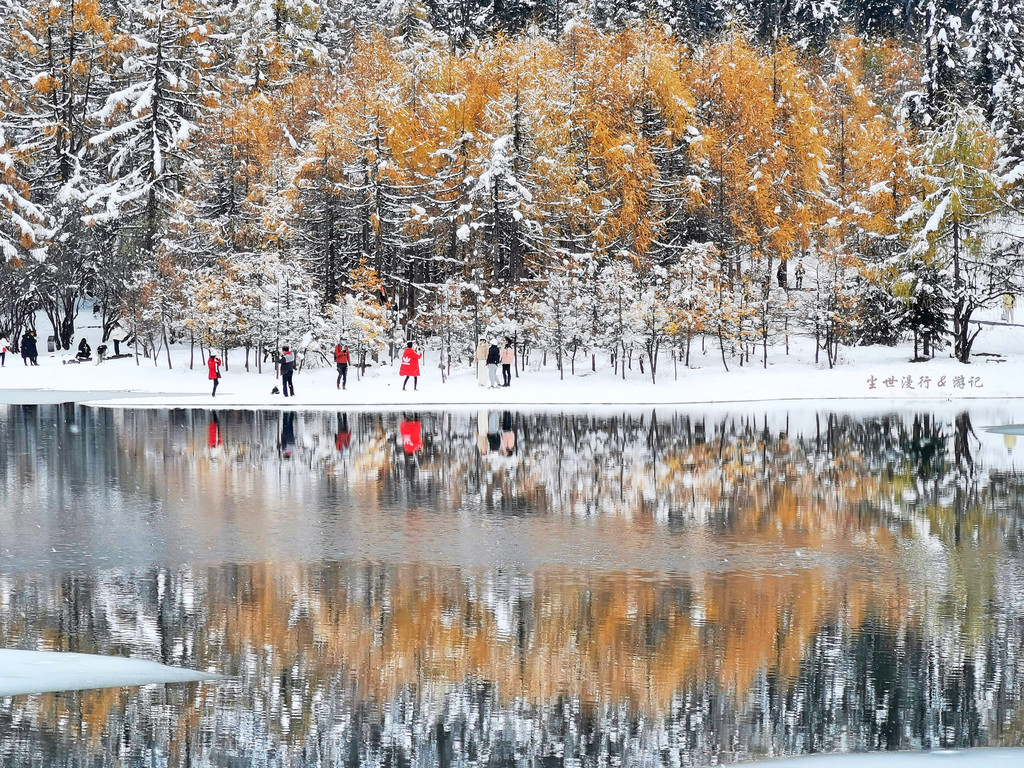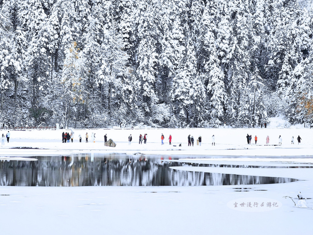 水天相接的天际湖,半冰半水的湖面上,映衬着彩林和银装素裹的世界,恬静里散发出一种意境之美。