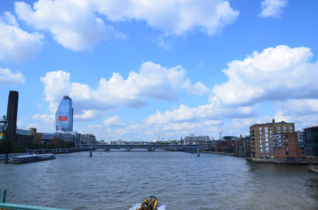 图 从上游回望碎片大厦。近处是坎农街铁路桥(Cannon Street Railway Bridge ),远处依稀可见伦敦桥及上面行驶的公交车,再远可见伦敦塔桥。