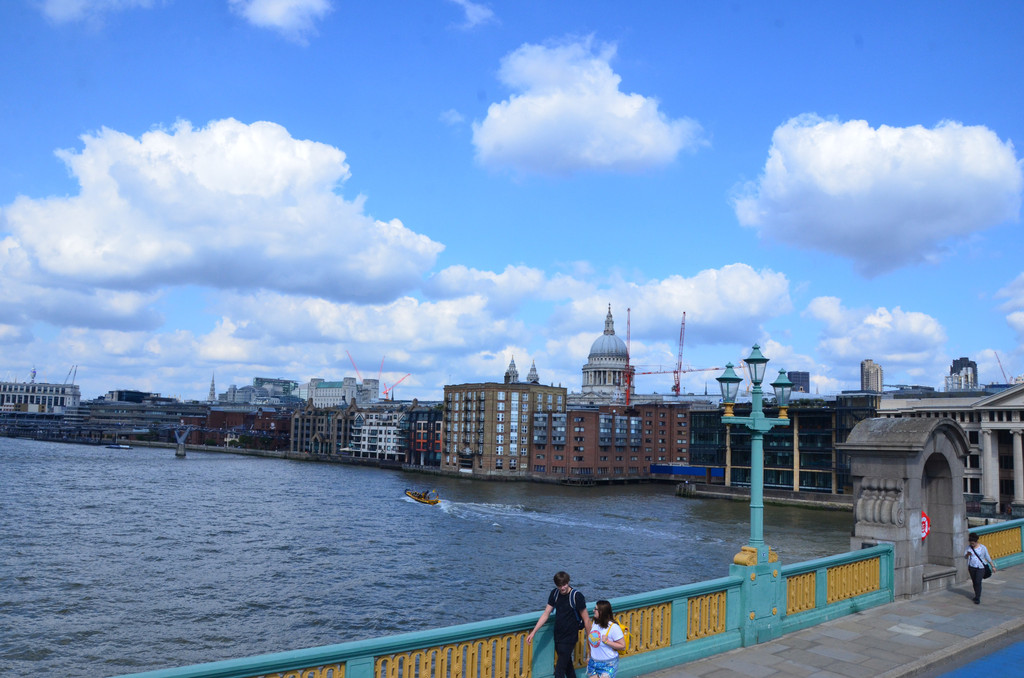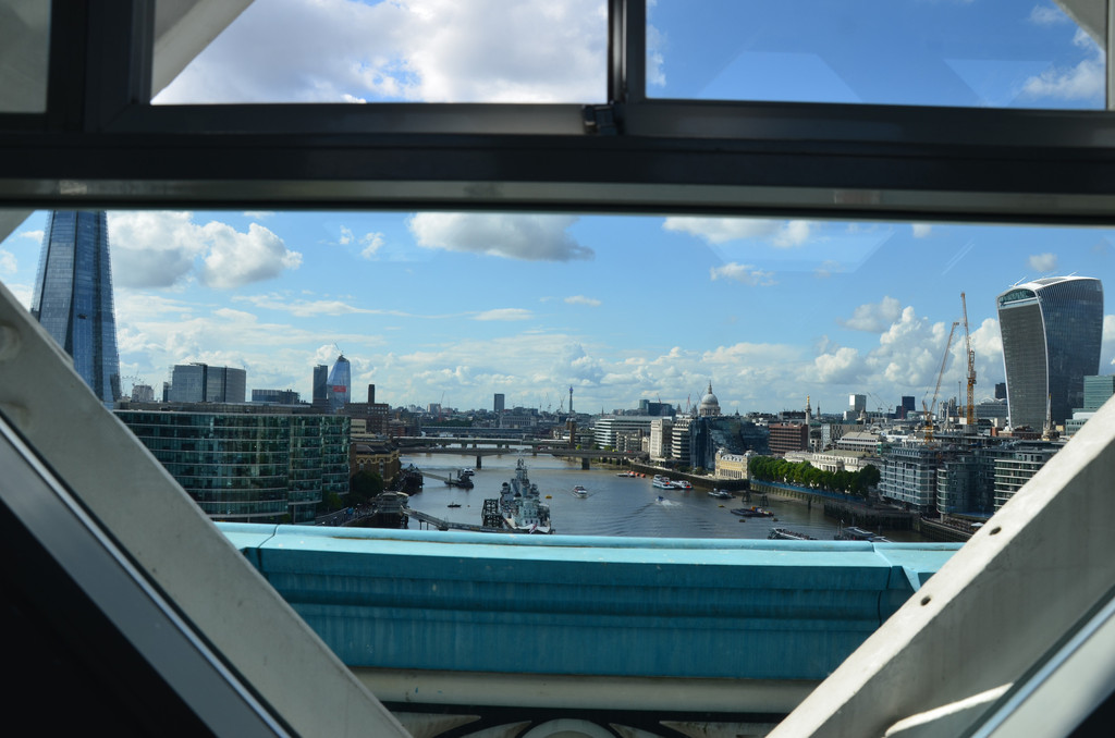 图 离开伦敦塔后,登上伦敦塔桥,河上风光尽收眼底。远处可见贝尔法斯特号巡洋舰和圣保罗大教堂穹顶。