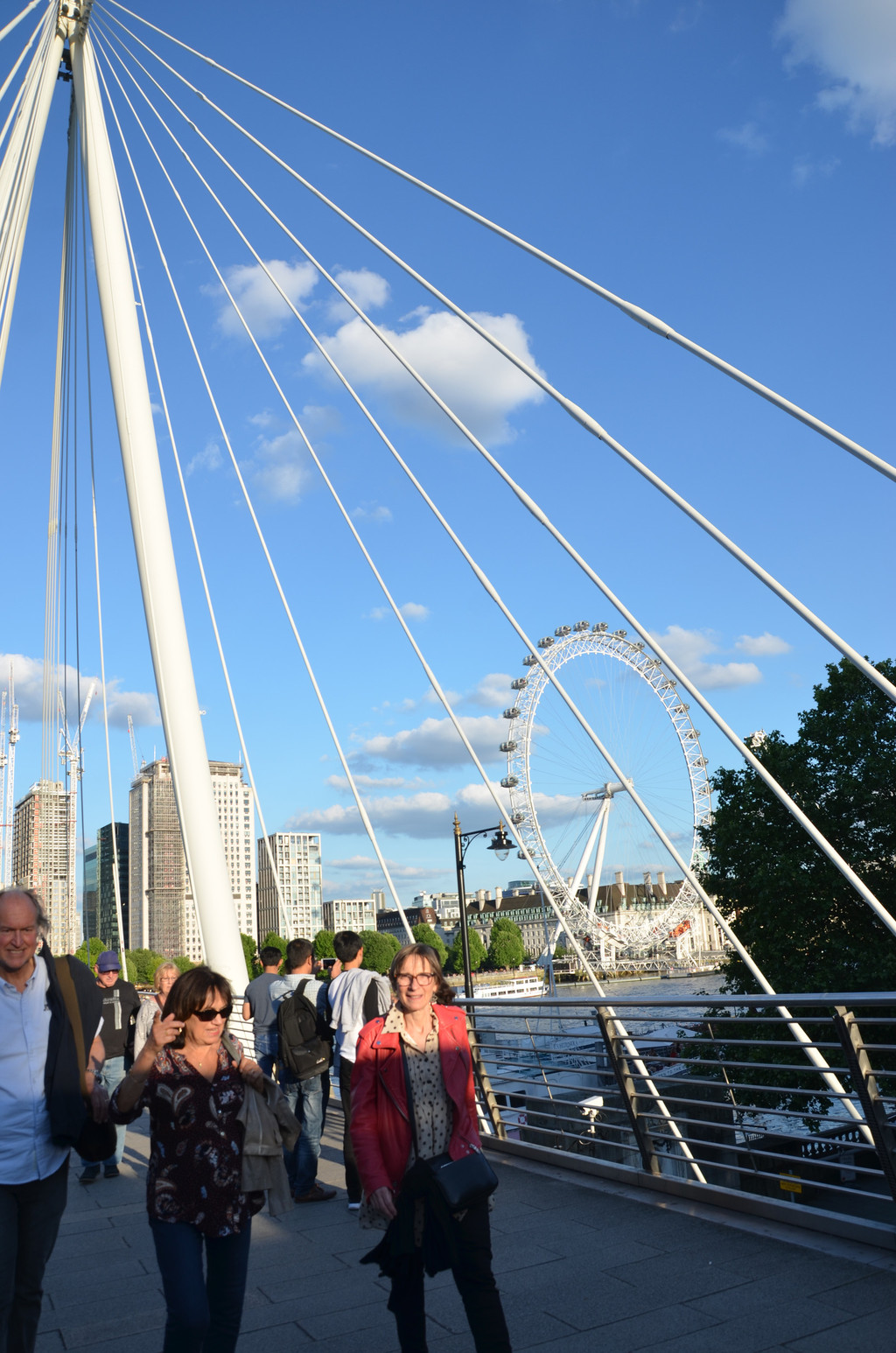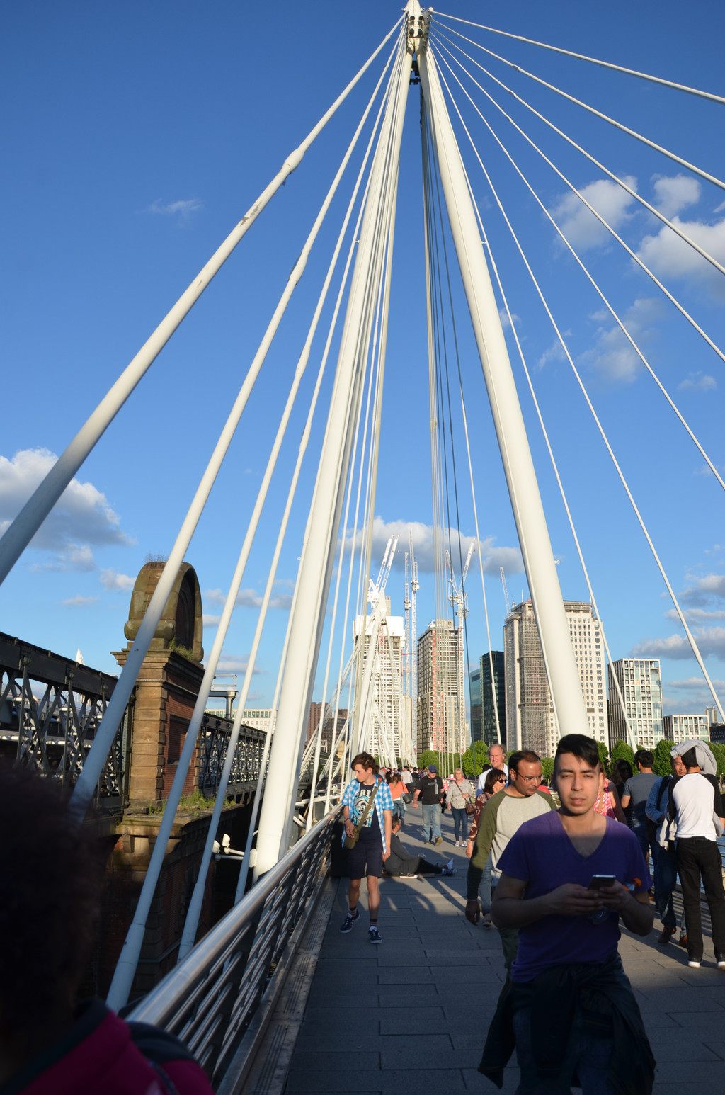 图 亨格福特铁路桥两旁各伴有一座步行桥,2002年开通,名为 Golden Jubilee Bridge,以庆祝伊丽莎白女皇在位五十周年。