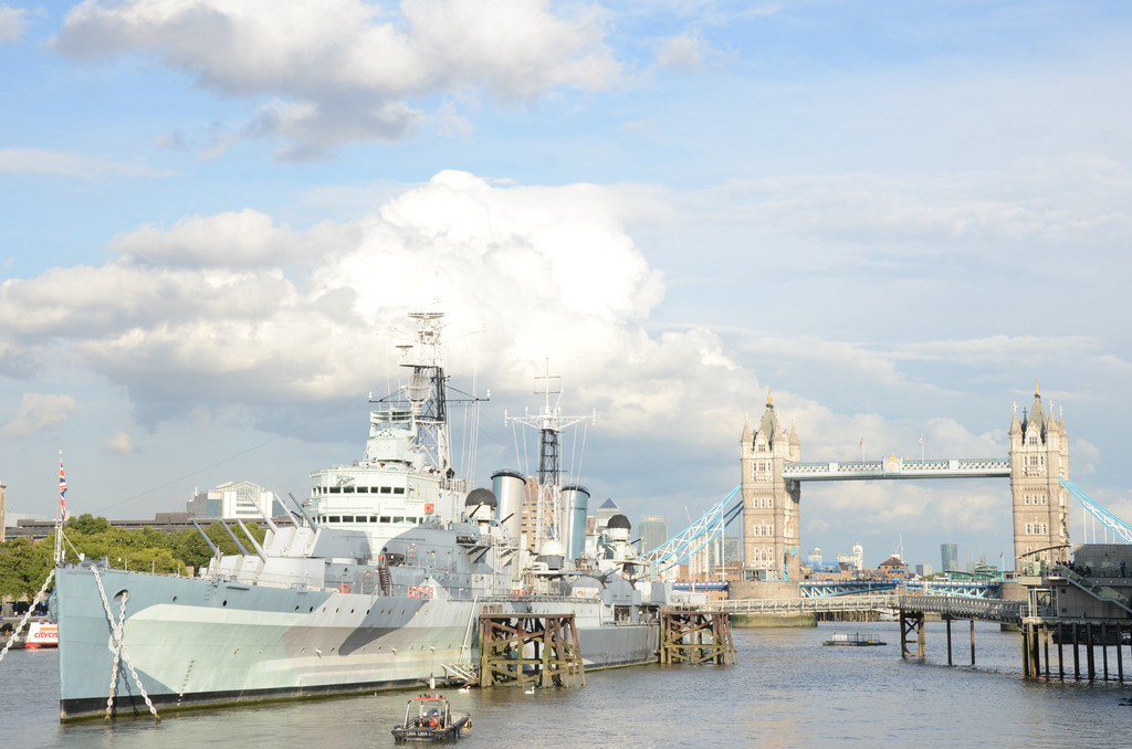 图 从伦敦塔桥下到泰晤士河南岸,古意盎然的伦敦塔桥和现代感十足的贝尔法斯特号巡洋舰,在蓝天白云河水栈桥的背景映衬下,宛若一幅油画突现眼前。