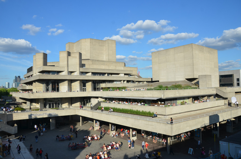 图 在滑铁卢桥上看南岸的国家剧场。这座1976年的建筑因其“野兽派”外观饱受非难,但内部设施高端,共有大中小三个剧场,适合不同种类的演出。服务也挺亲民,各层都有游客边观赏风景边享用咖啡,还有免费露天演出。