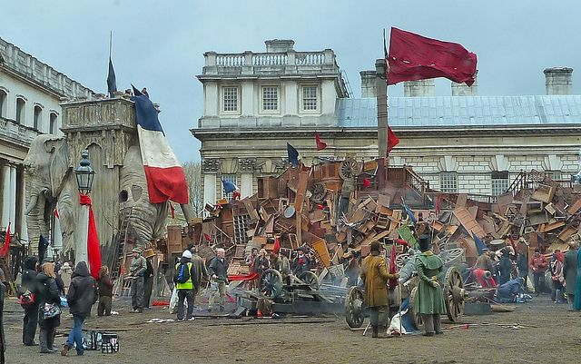 《悲惨世界》的故事虽然发生在巴黎,但电影取景地居然是英国国家海事博物馆。博物馆庄严的广场被改造成巴士底狱广场,制作组还为此打造了一头40英尺高的大象,作为拿破仑胜利的象征,在法国指挥官让·马克西米利安·拉马克的葬礼游行和随后的学生起义中,它都是最前卫的象征。据说制片人卡梅隆-麦金托什非常喜欢这头大象,制作完成后他让人把它搬到了英国的家中。