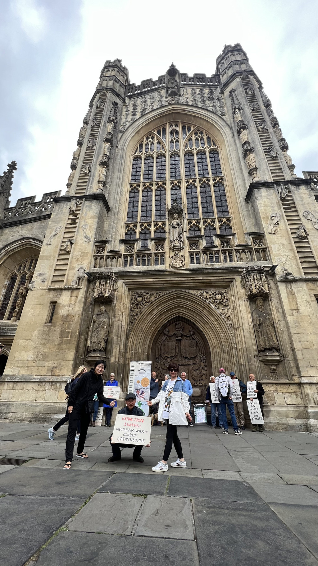 在巴斯修道院侧门口,一些民众拒绝核战争,防止气候灾难,生物灭绝。