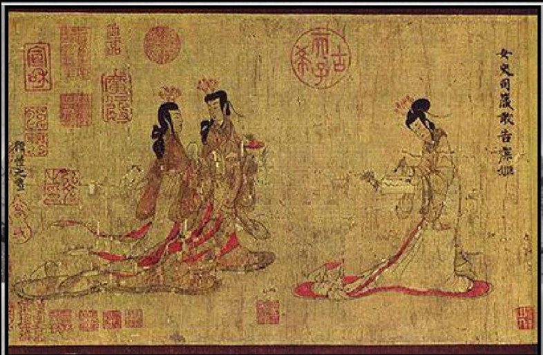 《女史箴图》所画的内容来源于西晋大臣张华的一篇诗文《女史箴》,主要是告诫宫廷女子该如何尊崇妇德,作者东晋顾恺之把它画得极具美感。画里顾恺之用“高古游丝描”完美勾勒出了众多人物形象,异常传神,他也因此被后人称为“中国画祖”。