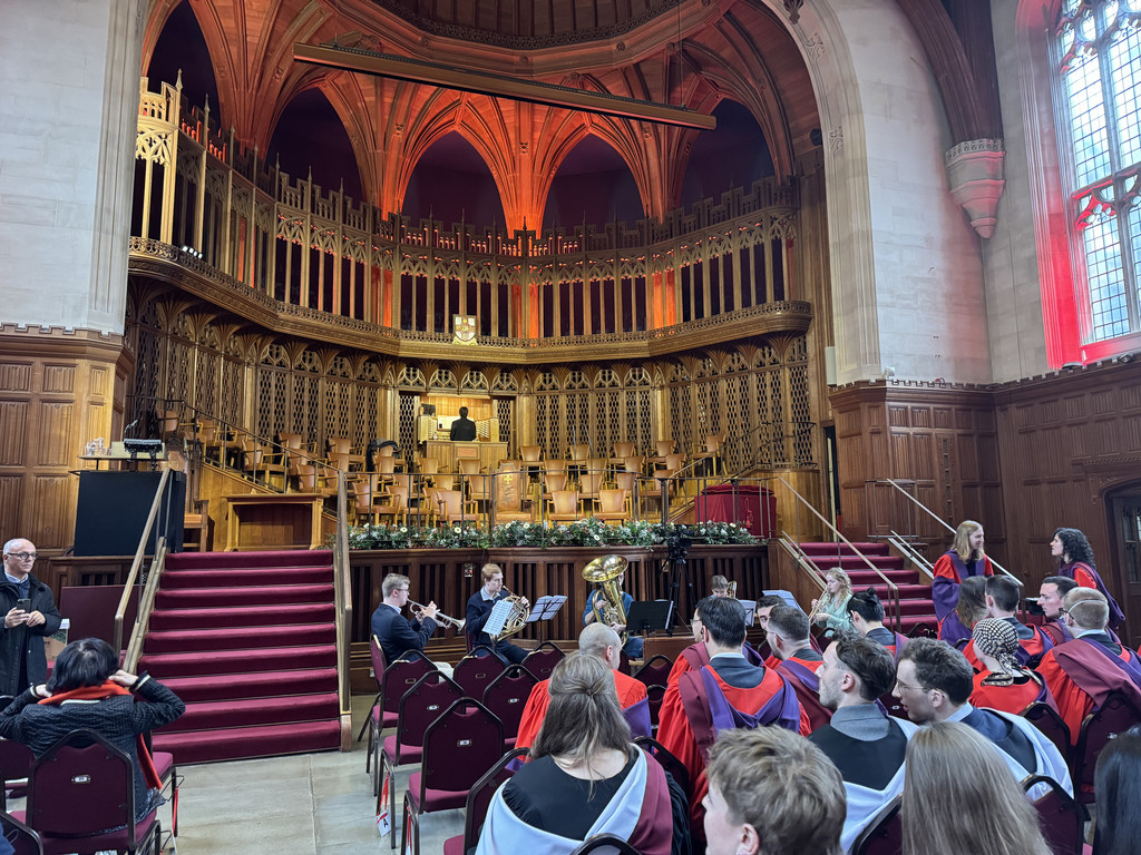 布里斯托大学的毕业典礼在Wills Memorial Building举行,建筑的里外都很美。整个空间高大、挑空很高、壮丽和雄伟,周围是古典式的柱子,深棕色格调显得古老庄严,吊顶和窗户是的装饰显得优雅明亮。虽然没有大教堂华丽,但也古朴典雅,大厅内没有典礼背景墙或者横幅。在所有家长及学生依次有序入场后,伴随管风琴乐曲前奏,全体起立欢迎校长、学监和教务长在捧着权杖入场。