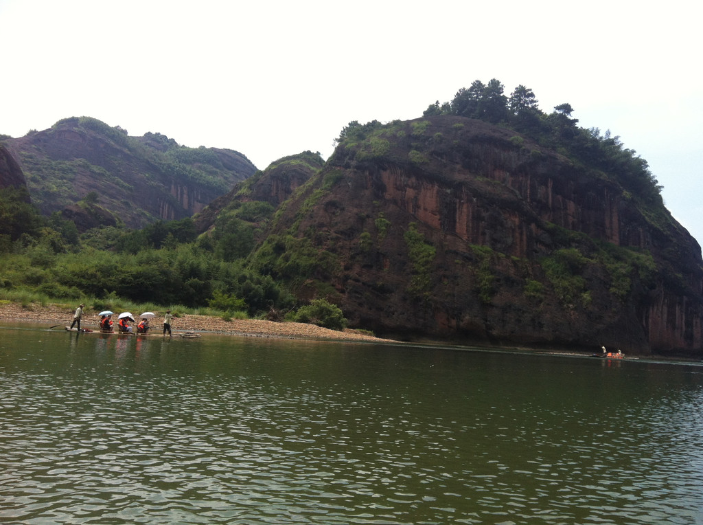 泸溪河的河道不像武夷山那样九曲十八弯,虽说游客们被要求穿上桔色的救生衣,但这不过是为了以防万一而已。平缓的水流,完全没有任何触礁翻船的危险。女性游客还打着遮阳伞,依旧坐得四平八稳。