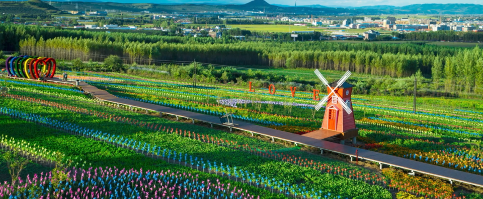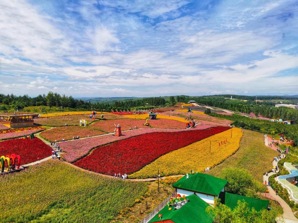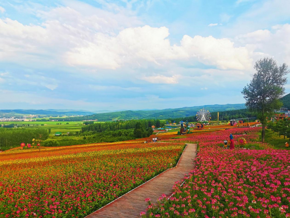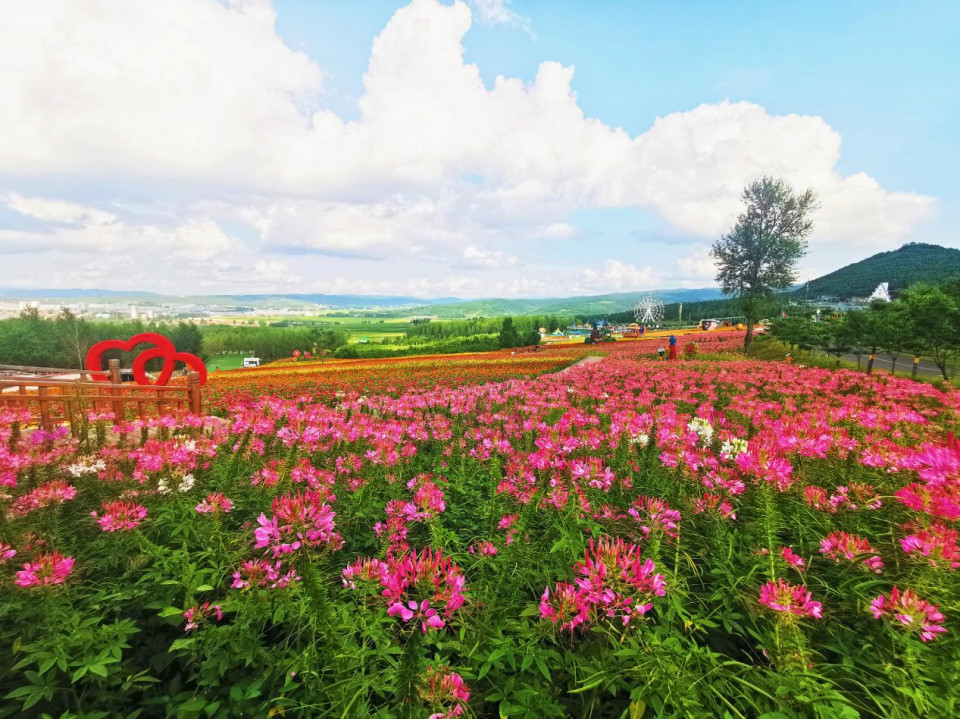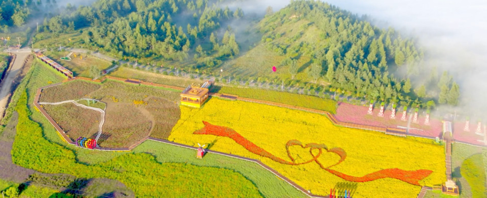 琵岩山风景区坐落于风景优美、人杰地灵的龙井市,自然环境优越,历史悠久,是中国朝鲜族第一市,也是中国朝鲜族发源地。琵岩山以430万平的超大体量,在中国朝鲜族民俗文化的基础之上,打造了数不胜数的娱乐项目。置身于此,您既可以尽情享受自然风光:天然森林氧吧,观赏美丽多彩的花海;体验时尚潮流的网红游乐设备:七彩速滑、天空之镜,好看又好玩;大型高空极限挑战项目:东北超长5D玻璃吊桥、悬崖秋千、高空滑索、高空漂流、林海飞龙、步步惊心、高空漂流等,分分钟刷新您的感官体验!您还可以享受到娱乐、休闲、美食一站式服务,近距离体验巴哈马群岛的粉红沙滩,坐观光小火车穿梭于荷兰风情园。如今正值金秋,金秋琵岩山,花开正当时。40万平花的海洋,是延边境内面积最大、种类最多的种植花海,其中有柳叶马鞭草、百日草、醉蝶、千日红、鸡冠花等13个品种。如今花香扑鼻,花姿摇曳,徜徉在40万平花的海洋,置身于二百万株花精灵的陪伴,绝对是你在金秋的不二选择!花开堪折直须折,莫待无花空折枝,言语难以尽述,直接美图奉上。首先是40万平花海的震撼视觉冲击,万花齐放耀天空,漫山花香仙境中,要是配上雾,你会陶醉的不知身在何处: