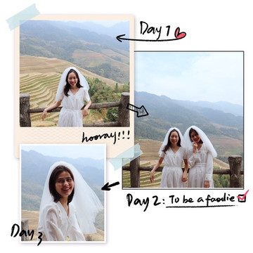 一直想和露子拍一下类似轻婚纱的主题,龙脊梯田的金黄背景也和白色主题很搭,因此我们基本没有太多游览景点,而是以拍照为主。