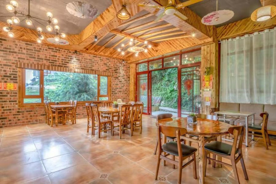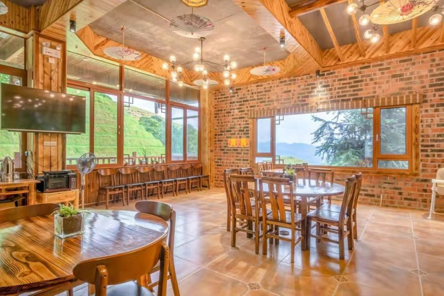 宽敞整洁的餐厅正对着梯田风景,270度透明的明亮大窗刚好将室外的绿野之景一一纳入室内,一边品尝着美食,一边观赏美景,赋有田园诗意的美妙意境引人入胜。