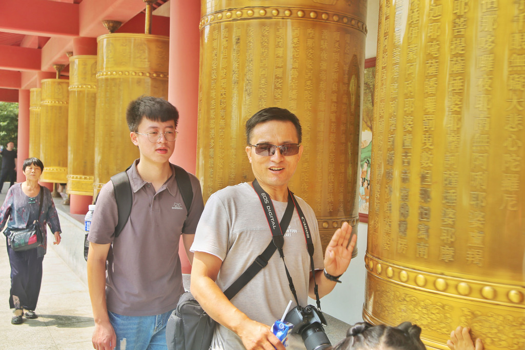 莲花座上大佛跏趺而坐,莲花座是由108块莲花瓣花瓣组成(我数过了),每块莲花瓣都比我高出许多。大佛莲花座下建有功德堂、万佛堂、佛教历史博物馆,万佛堂内陈列着9999尊造型逼真、栩栩如生的金铜佛像,与大坐佛共同构成了万尊佛象的宏大阵容。大佛四周的栏杆上系满了祈福许愿红丝带,我们也系了一条,上面写上家人的名字,妈妈说这会带给我们平安幸福。来到转经回廊,每个人都走了一遍,带着对家人的祝福和对未来的期许。小朋友走的时候特别认真,猜猜他的祈祷什么呢?