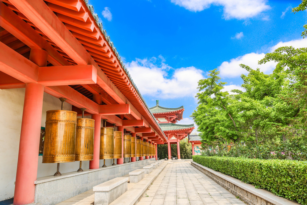 南山华严世界就位于大佛下方的广场上,由五座佛殿和动感音乐喷泉、转经回廊等组成。夏日午后的风吹拂着转经筒,轻轻地,柔柔地,好似这山间的风也晓得这里是佛门圣地,故意放轻了动作。佛音响起,喷泉涌动,我站在广场中央,内心平静如水。