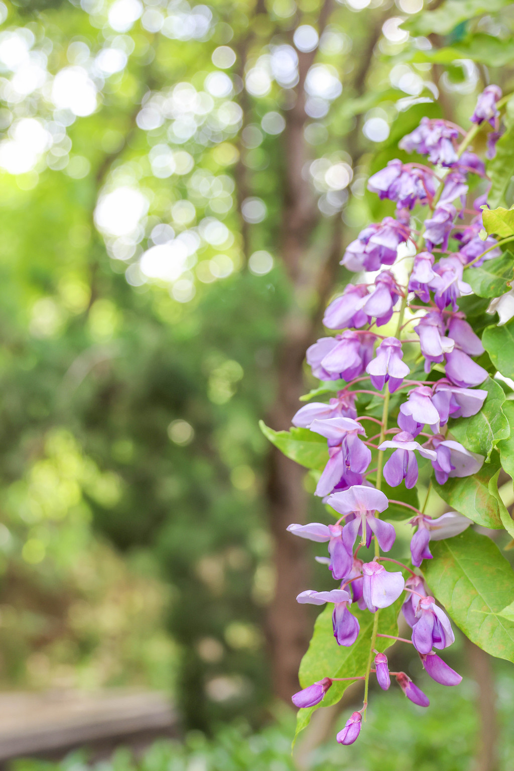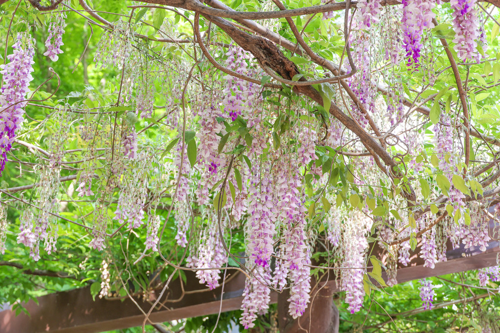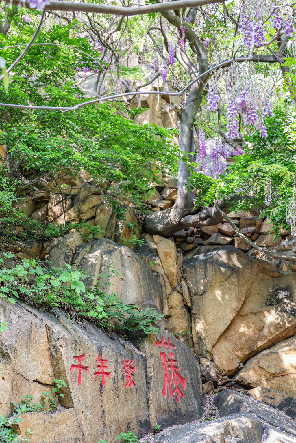 听闻景区有两株千年紫藤,我很好奇,决定去一探究竟。一路上听着紫藤姑娘的传说, 对那两株千年紫藤更加好奇了。紫藤的芳香越来越浓郁,我知道,千年紫藤就在附近了。“看,这就是千年紫藤!”我顺着导游小姐姐指的方向望去,看到那株紫藤几乎与山石长在了一起,不见其树根,只看到粗壮的盘虬卧龙般的枝干以及深深浅浅交织在一起的紫色花海。再往前走不远即是另一株紫藤。这株紫藤开得也很繁盛,我不由得想起了宗璞在《紫藤萝瀑布》所描述的紫藤花盛开的画面。在紫藤花下小憩,看一场演出,品一盏茗茶,夏日的时光被拉得悠长。