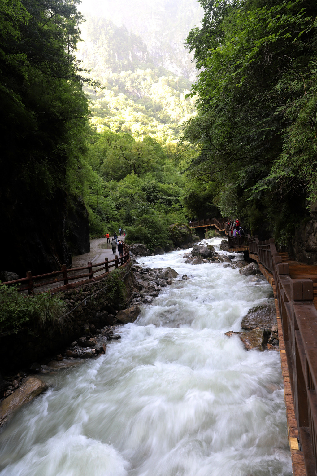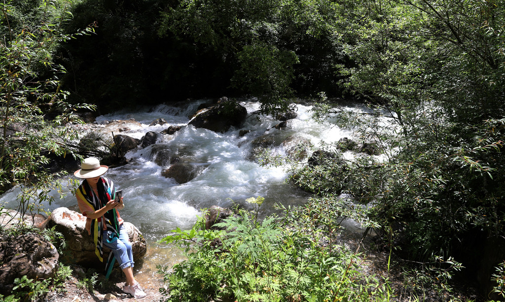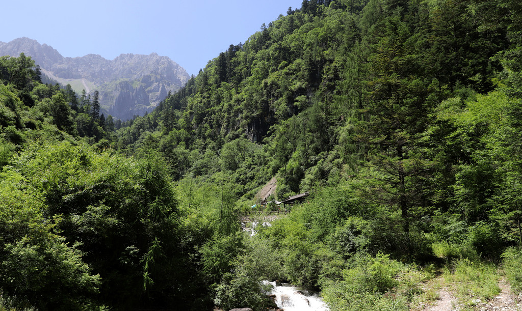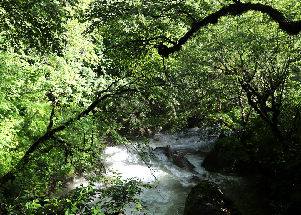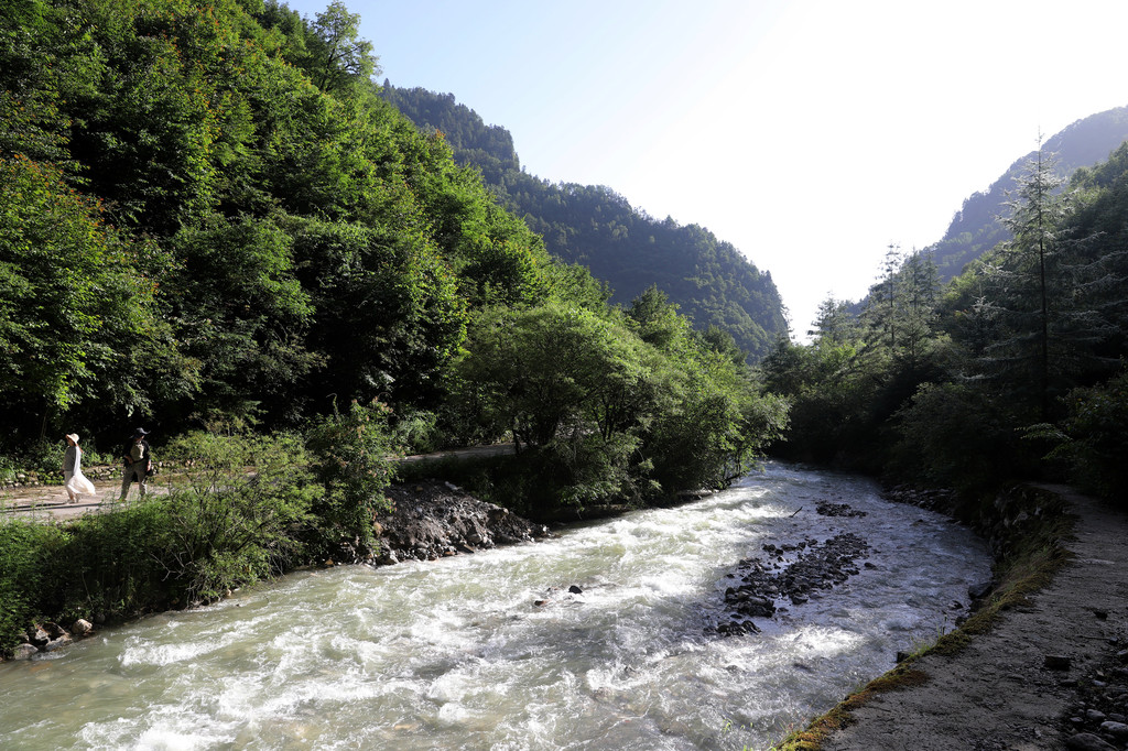 沿途茂密的树林和潺潺的流水以及各种高山花卉