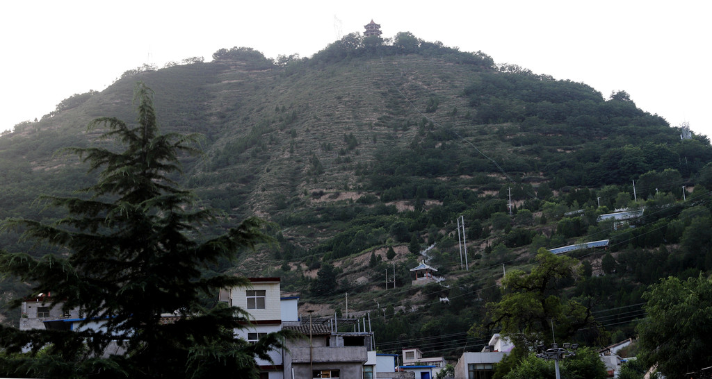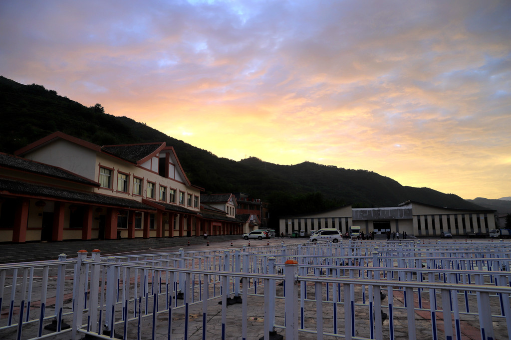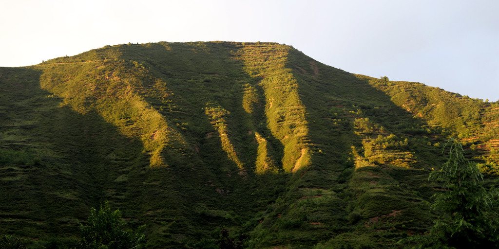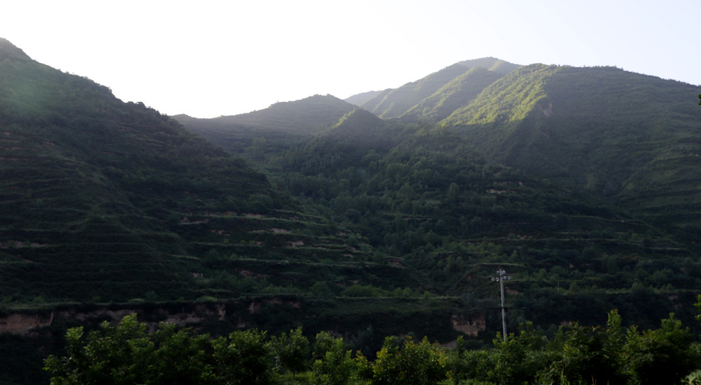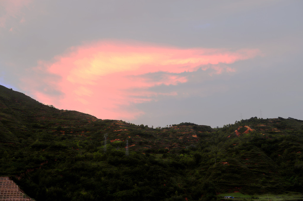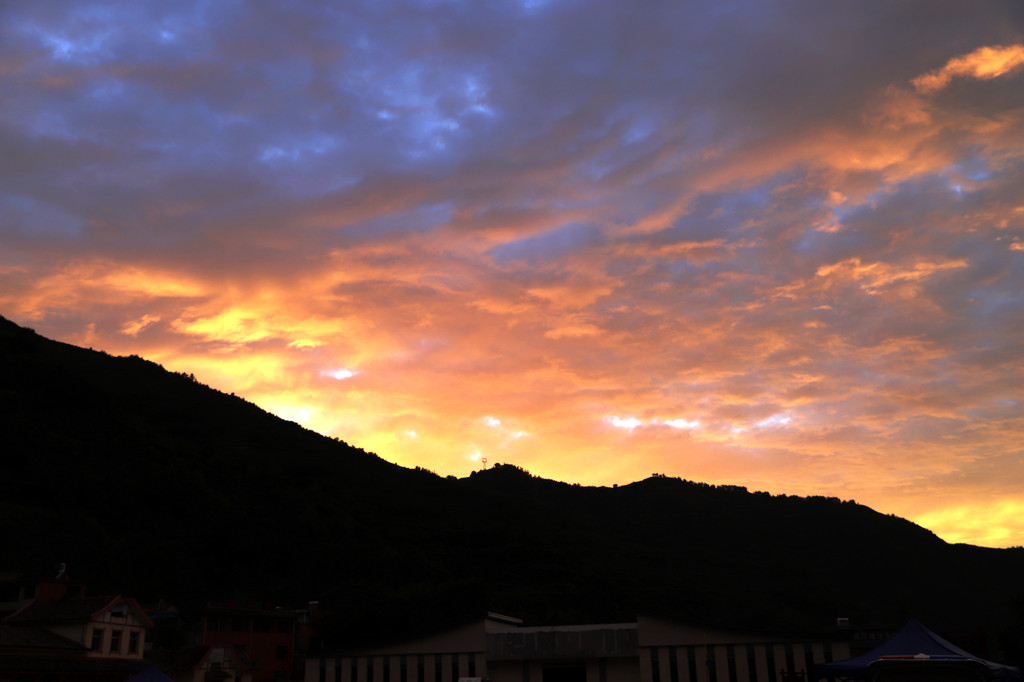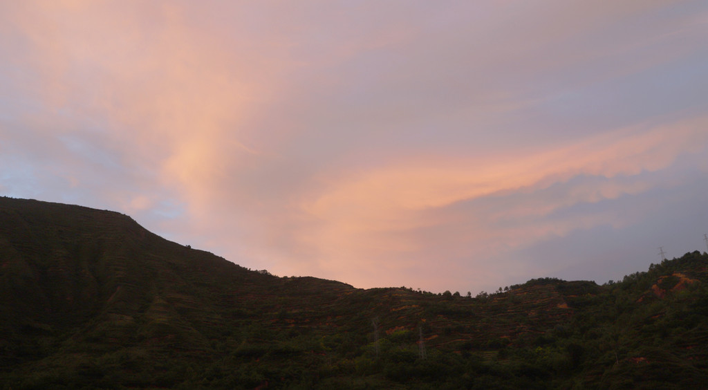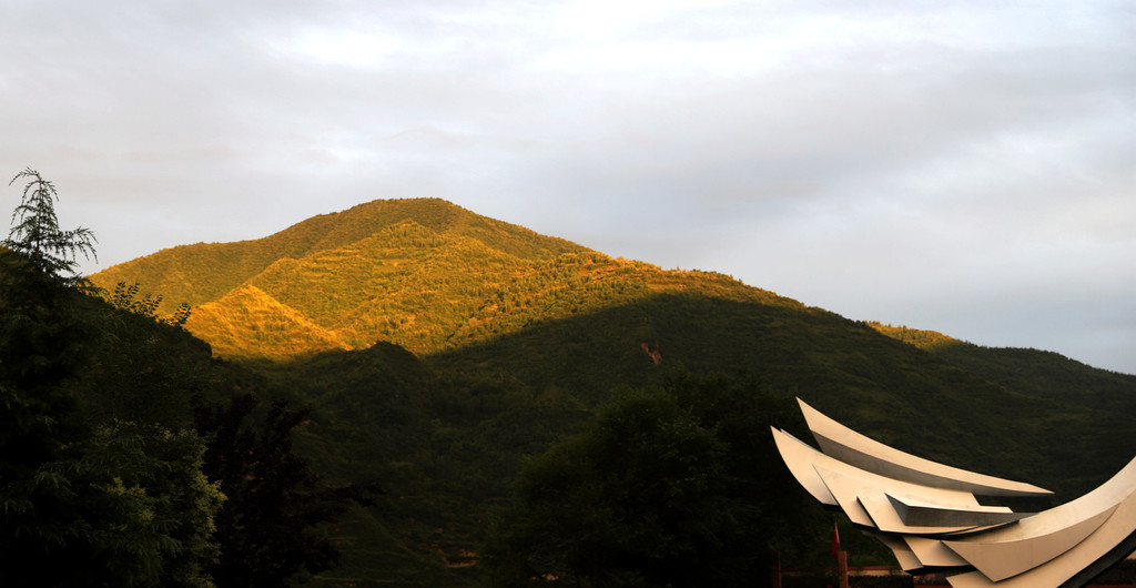 25号傍晚时分,天气由阴转为多云间晴,预测可能会出现晚霞,故拿上相机走到景区大门口(住在景区内的农舍宾馆),搜寻可拍摄场景,突然看见夕阳照射在对面的山顶部分,好似日照金山,于是拿出相机拍了几张。
