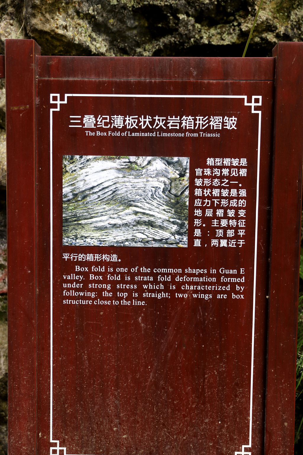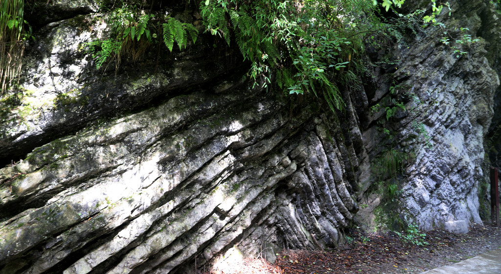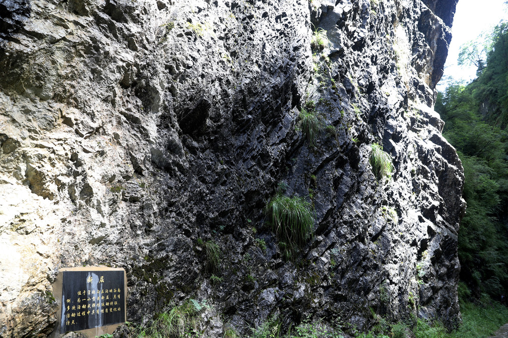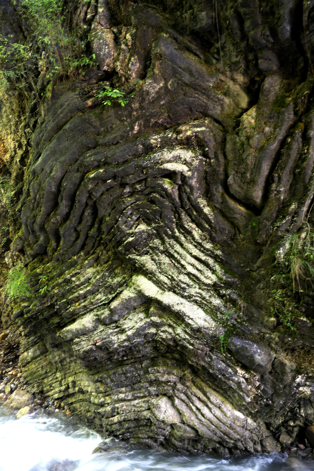 刚开始游览时,我对官珠沟的地形地貌还不太感兴趣,一看那告示牌上介绍的生僻难懂的地质名词就望而生违,头就痛了。但一路走去,看到各种千奇百怪的岩体层面,就感到非常惊奇!惊叹大自然的鬼斧神工!官鹅沟被称为“地质公园“就不足为奇了。