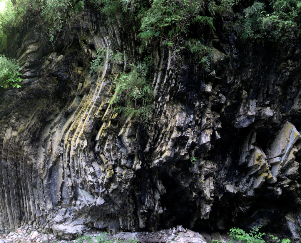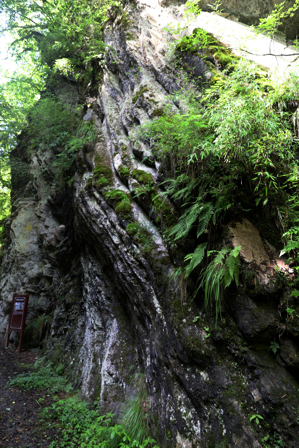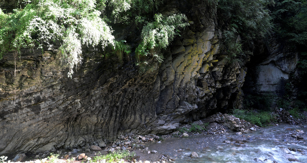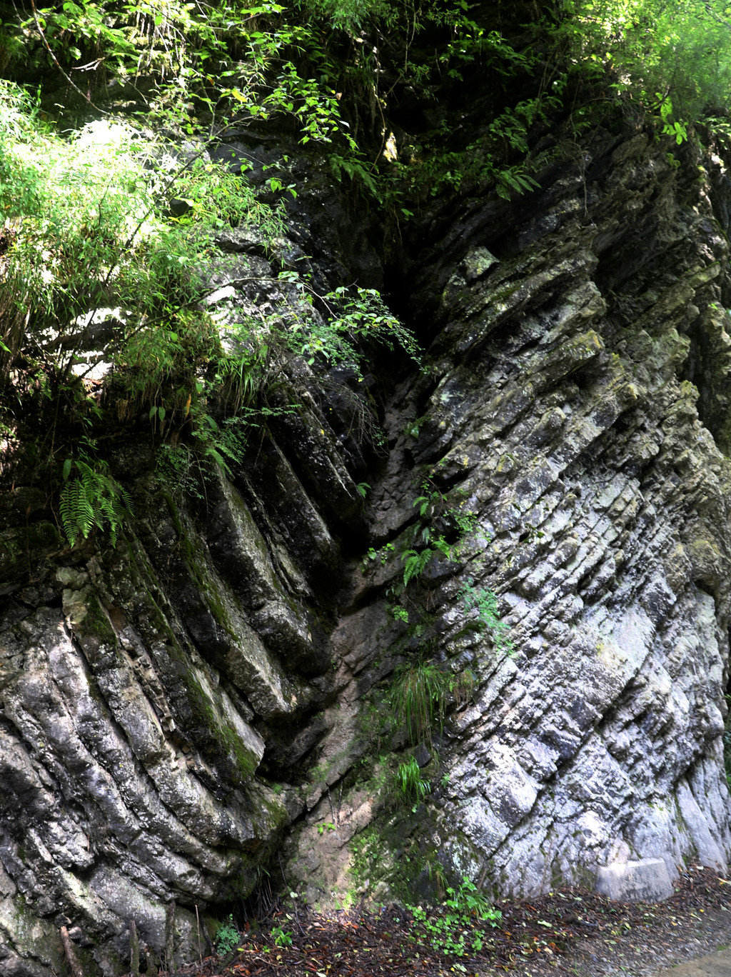 刚开始游览时,我对官珠沟的地形地貌还不太感兴趣,一看那告示牌上介绍的生僻难懂的地质名词就望而生违,头就痛了。但一路走去,看到各种千奇百怪的岩体层面,就感到非常惊奇!惊叹大自然的鬼斧神工!官鹅沟被称为“地质公园“就不足为奇了。
