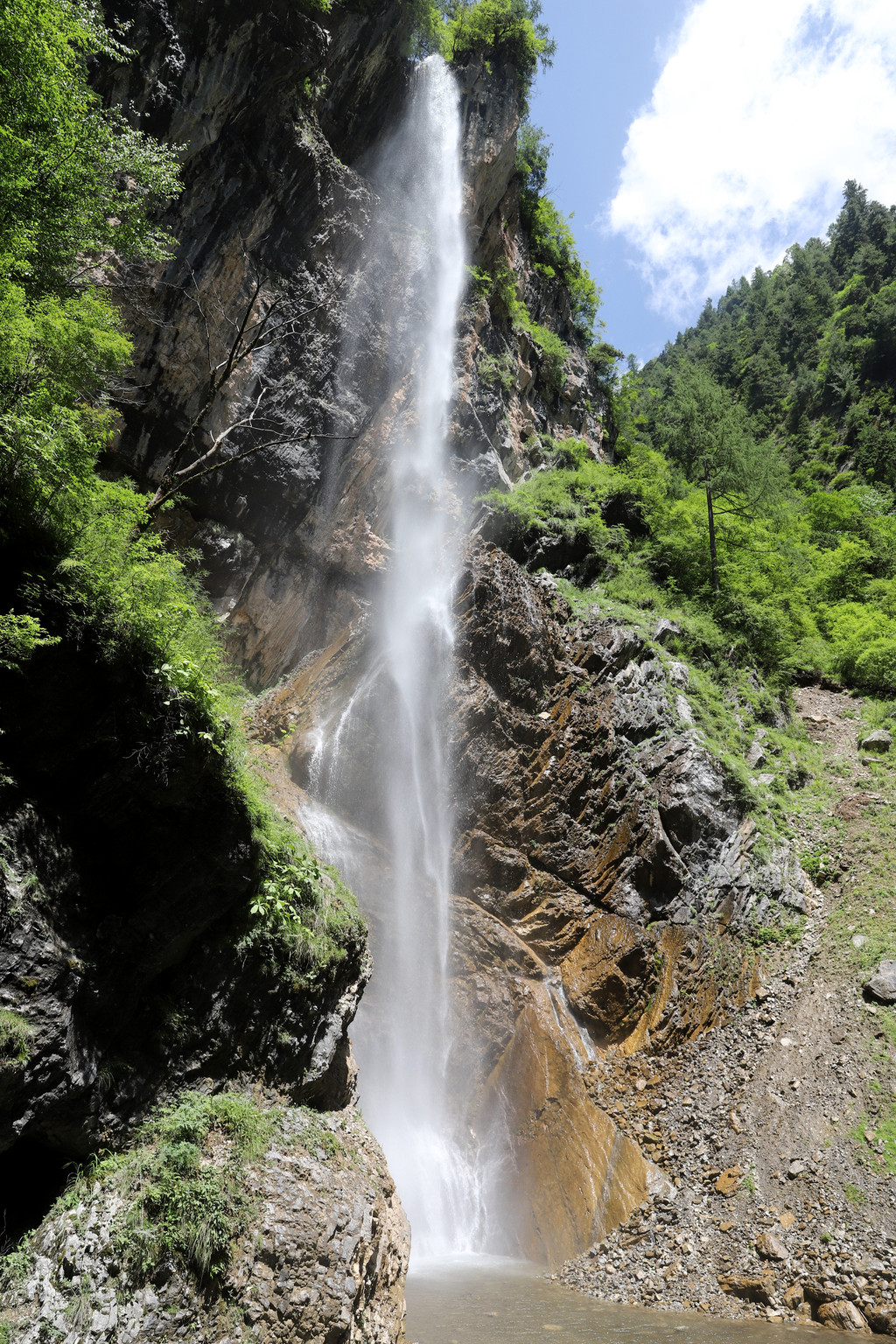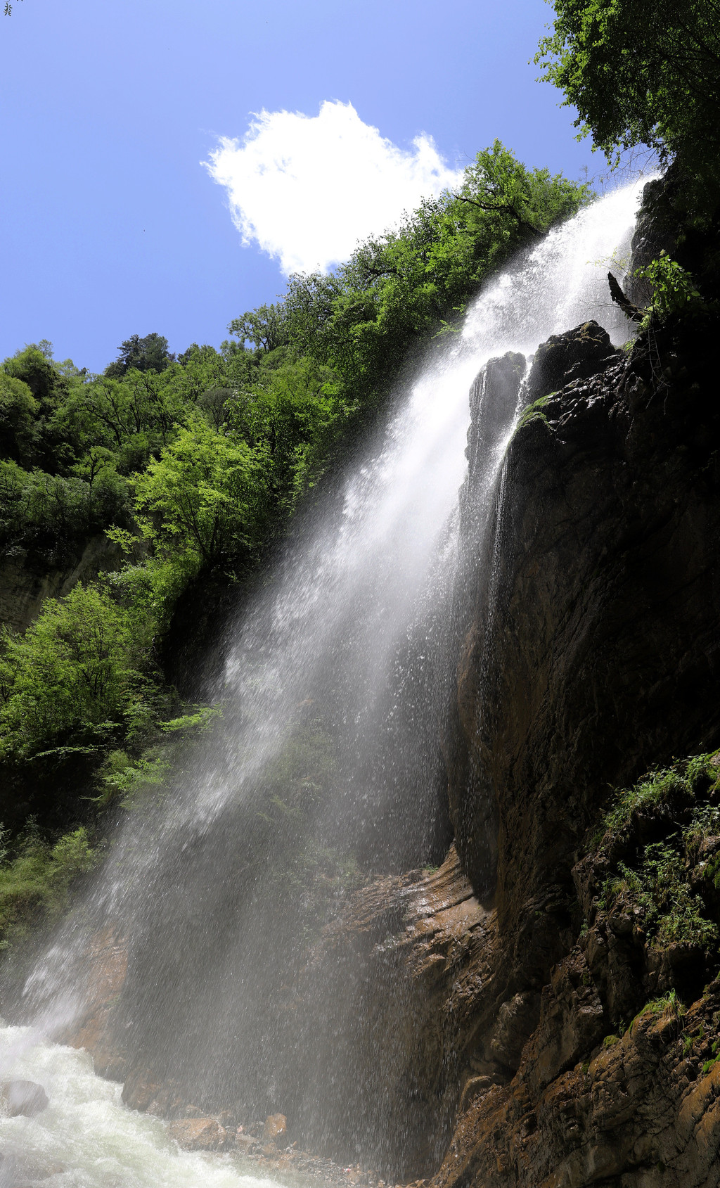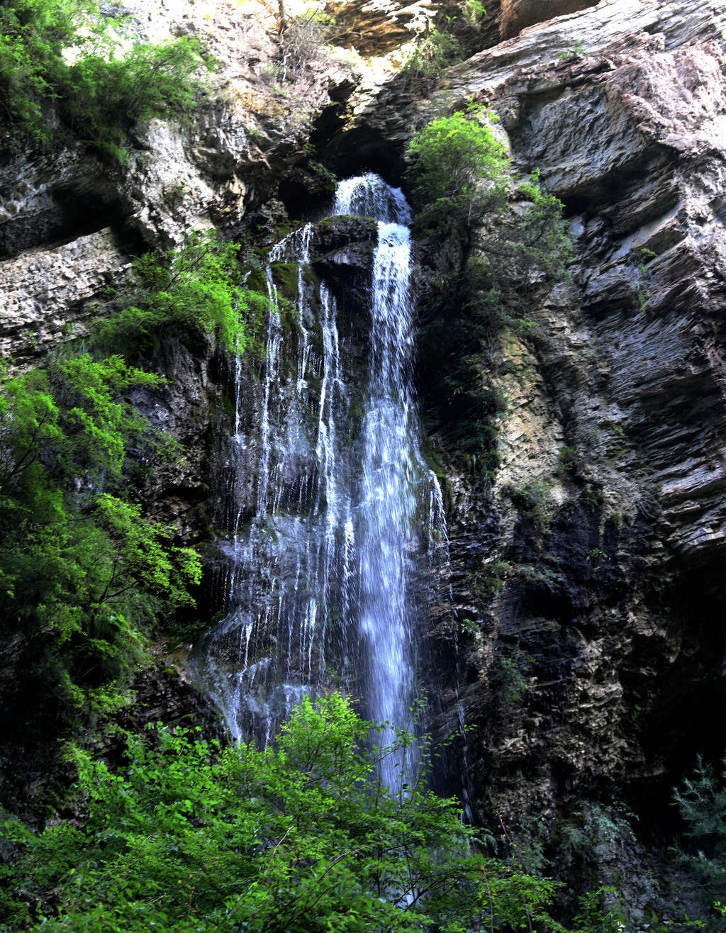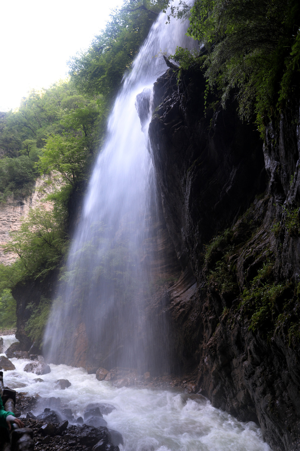 官珠沟最壮观的瀑布是官鹅天瀑,这个景点可以称为官鹅沟的镇沟之宝。你如读过李白的诗“飞流直下三千尺“,在这里就可得到最全面、最完美的诠释。一条如练飞溅的巨龙,从高高山峰的顶端飞流直下,跌落在山峰下部的岩石上,激起万朵水花,如有风儿吹来,飞瀑则成扇面散开,形成一堵水墙。场景很是壮观!
