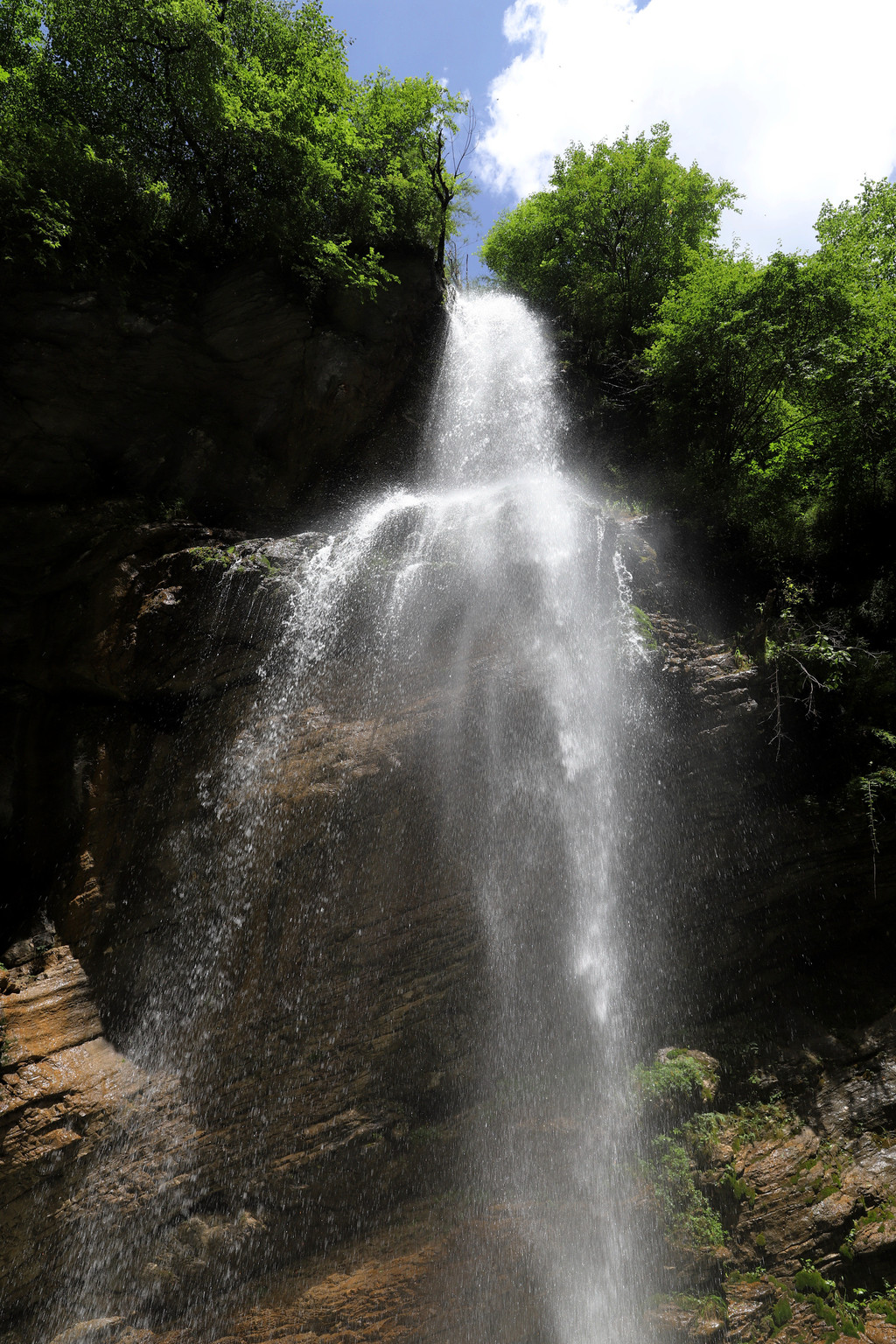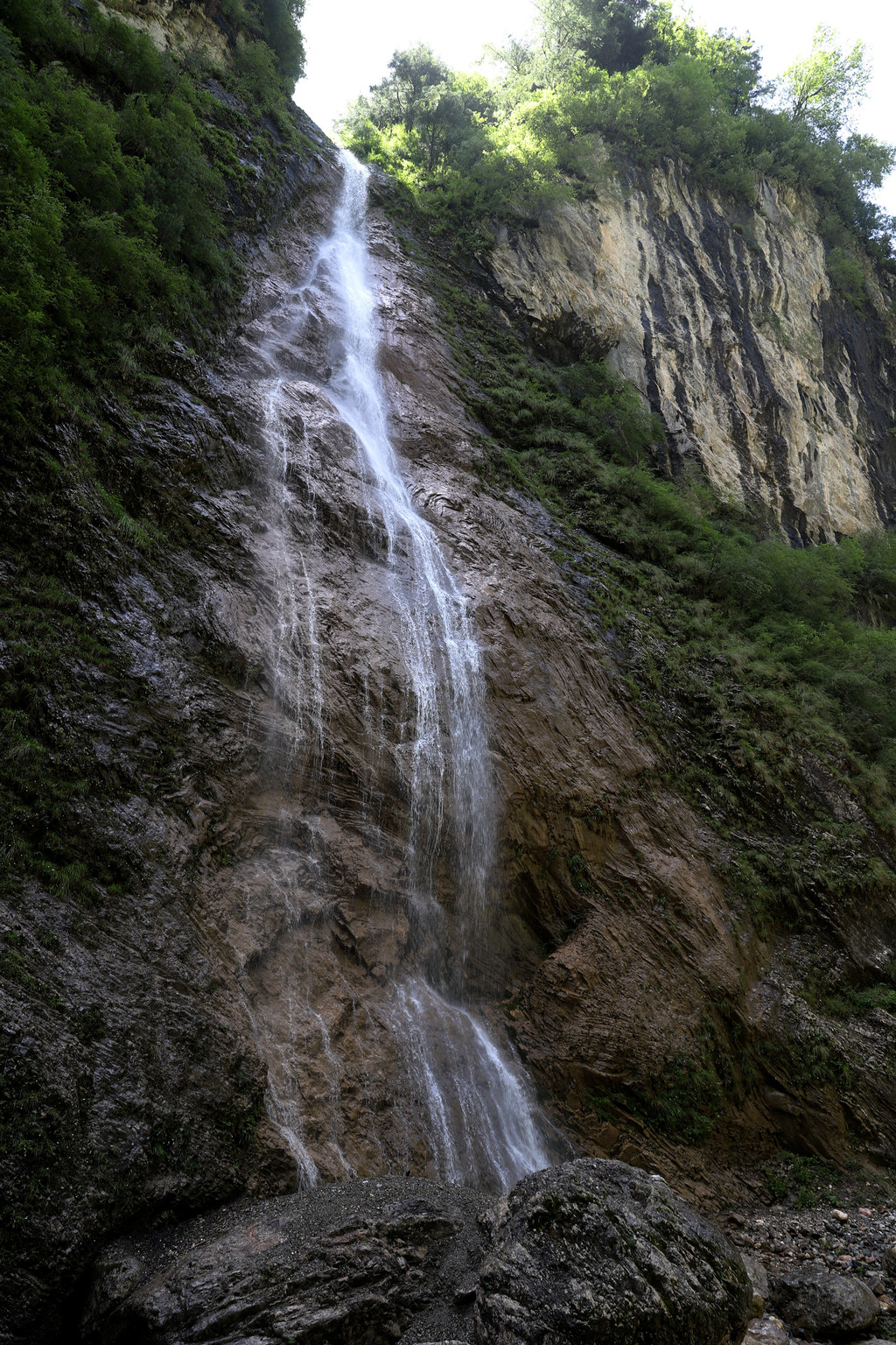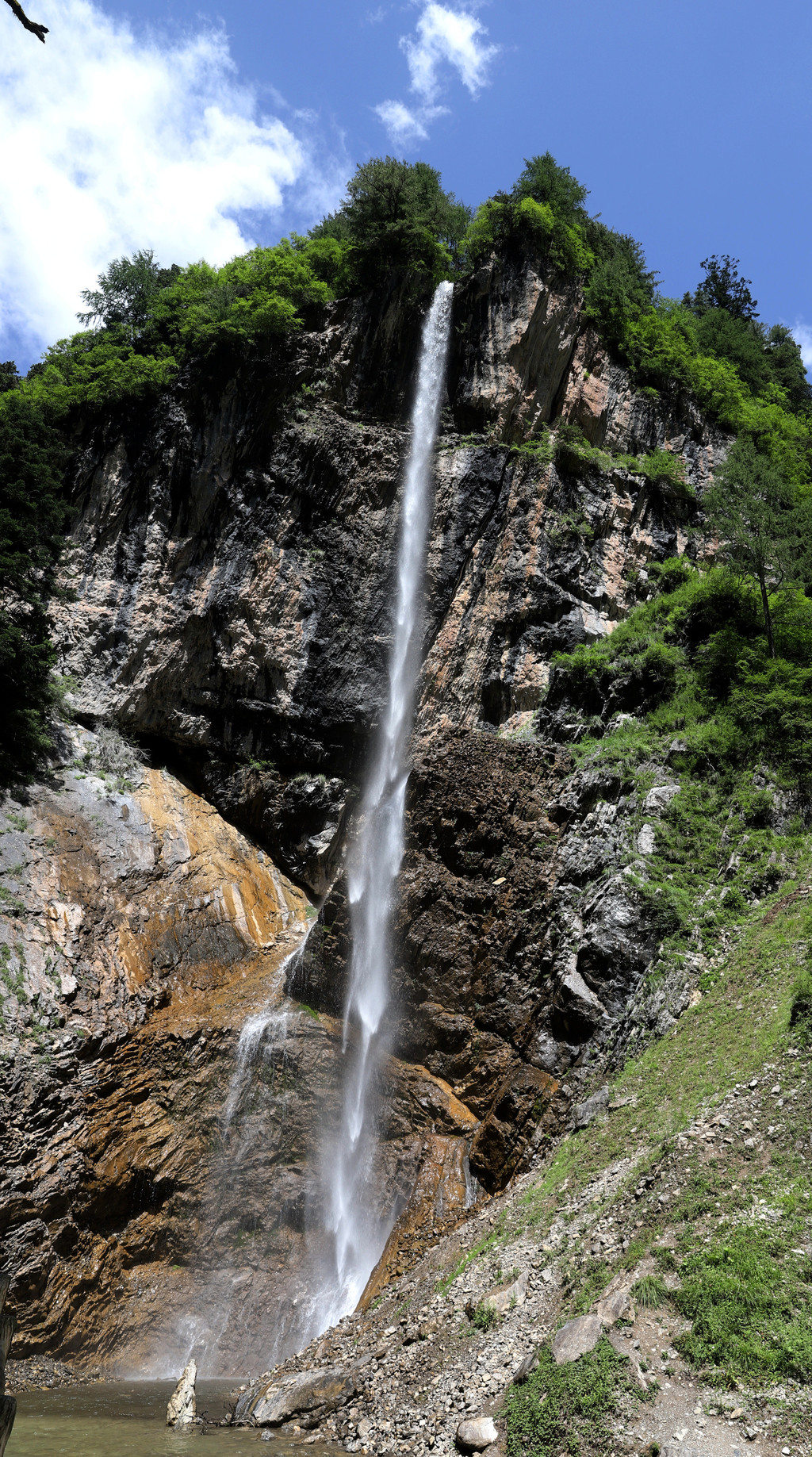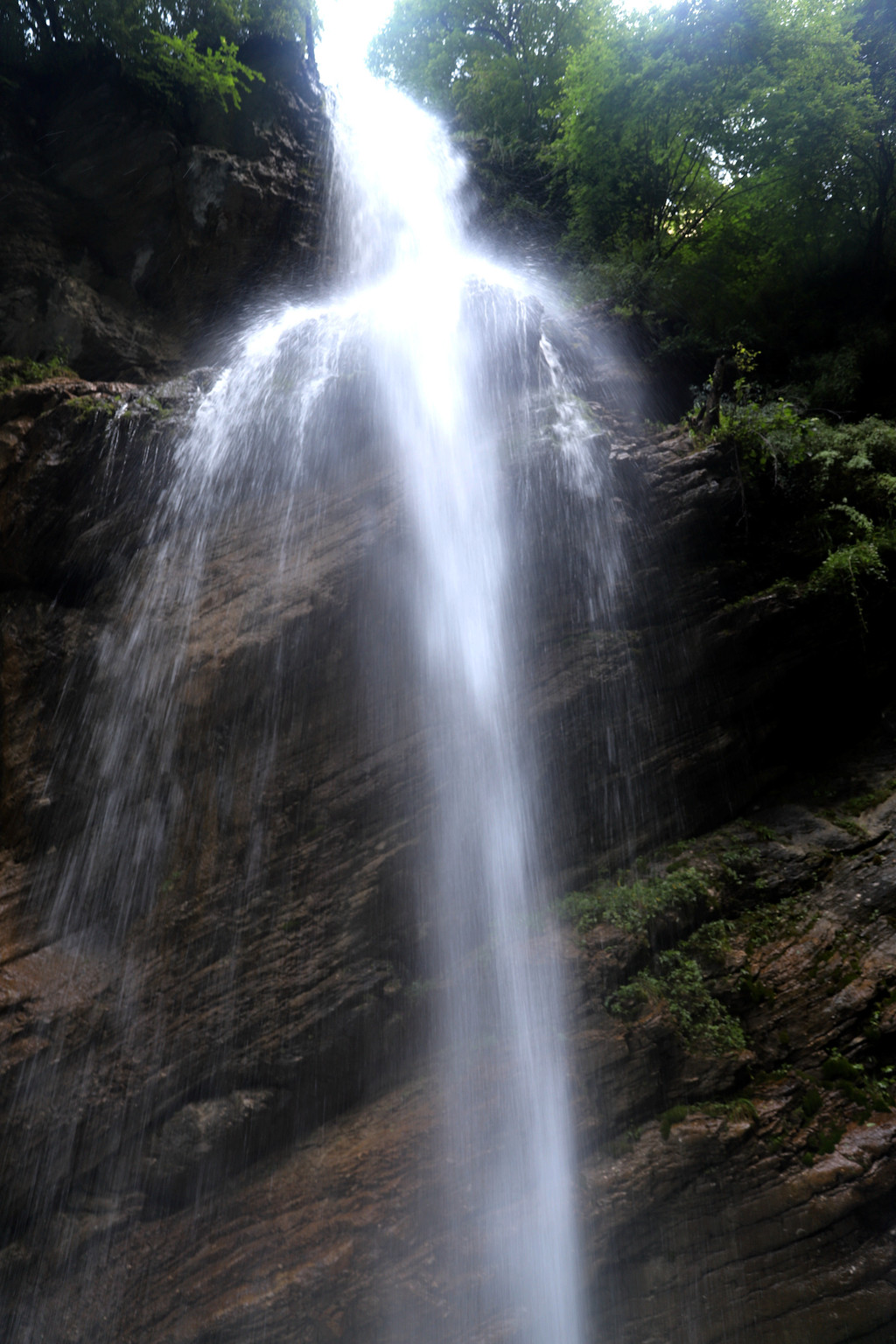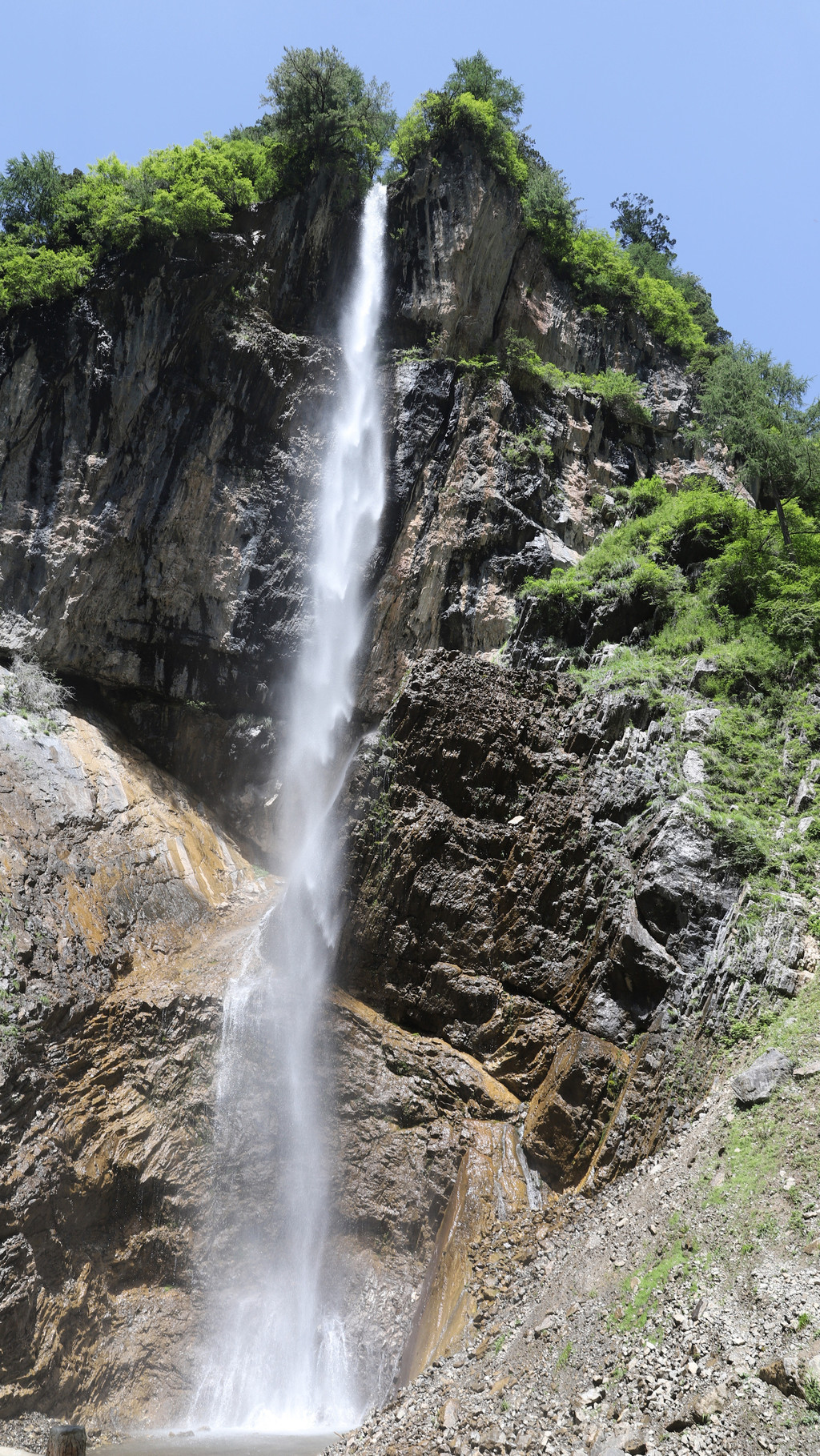 官珠沟最壮观的瀑布是官鹅天瀑,这个景点可以称为官鹅沟的镇沟之宝。你如读过李白的诗“飞流直下三千尺“,在这里就可得到最全面、最完美的诠释。一条如练飞溅的巨龙,从高高山峰的顶端飞流直下,跌落在山峰下部的岩石上,激起万朵水花,如有风儿吹来,飞瀑则成扇面散开,形成一堵水墙。场景很是壮观!
