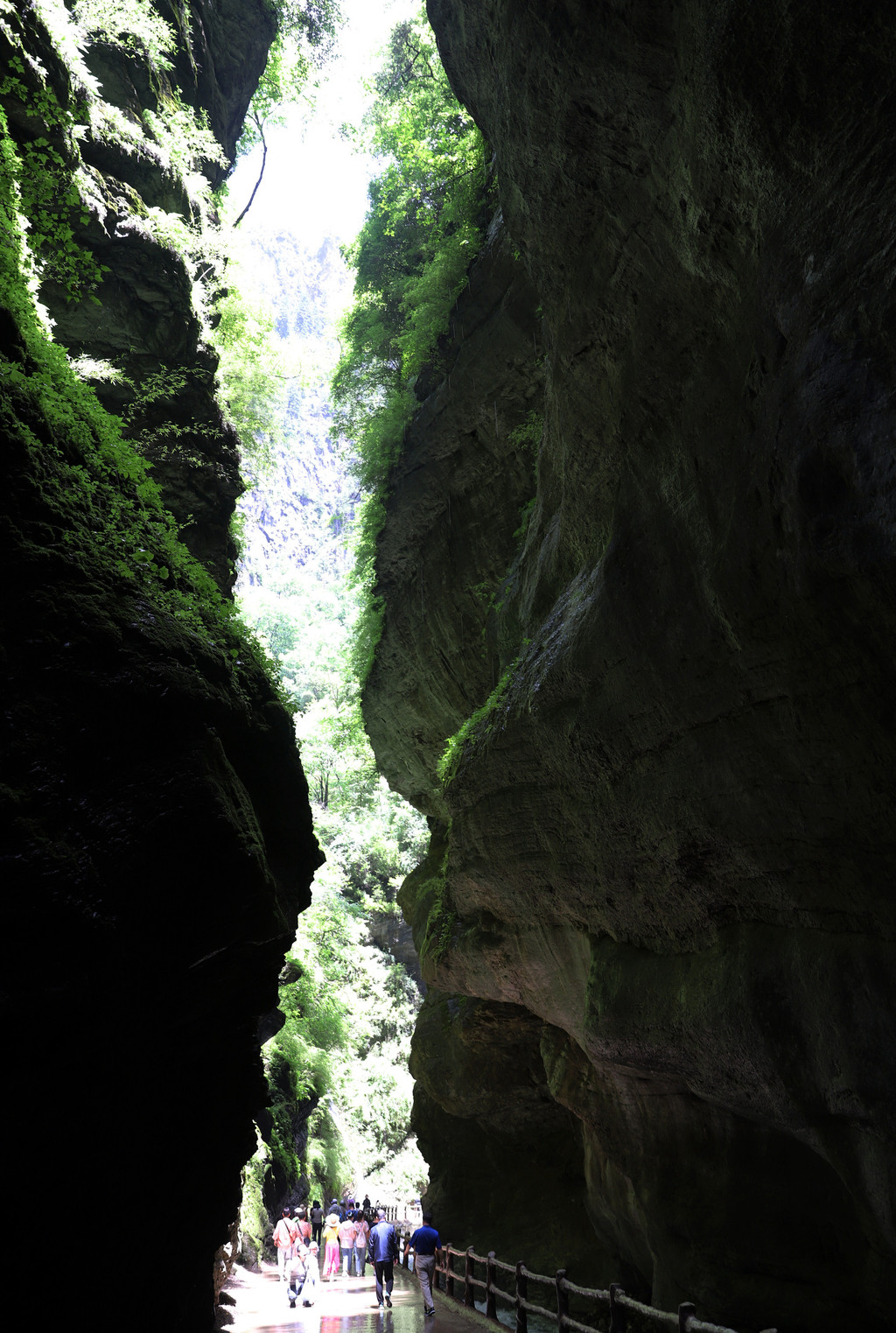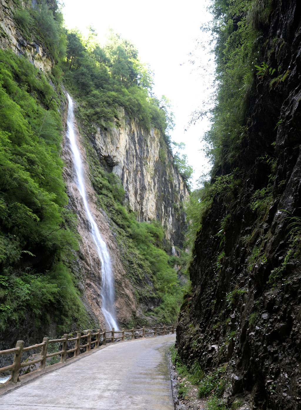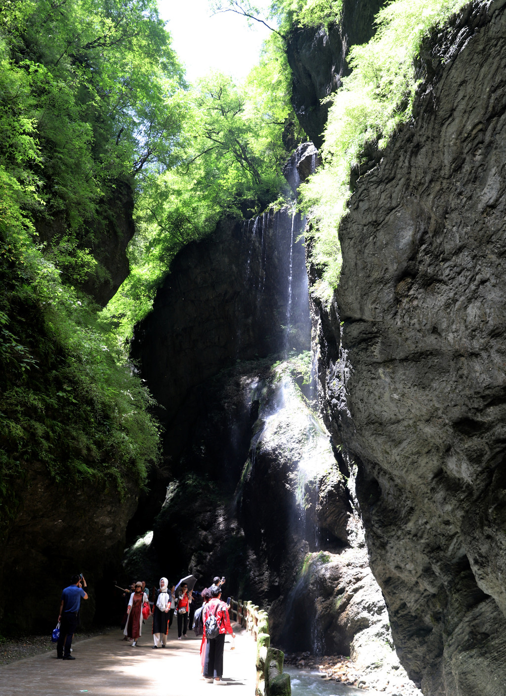 官鹅沟除了有形态各异的飞瀑之外,还有数个峡谷,主要有通天峡、五谷峡、盘龙峡、五瀑峡、地书峡、嬉水峡、对瀑峡等峡谷,其陡峭的山势形成了各种不同的造型,在高山飞瀑、潺潺流水和绿荫大树的映衬下,显得非常壮美。