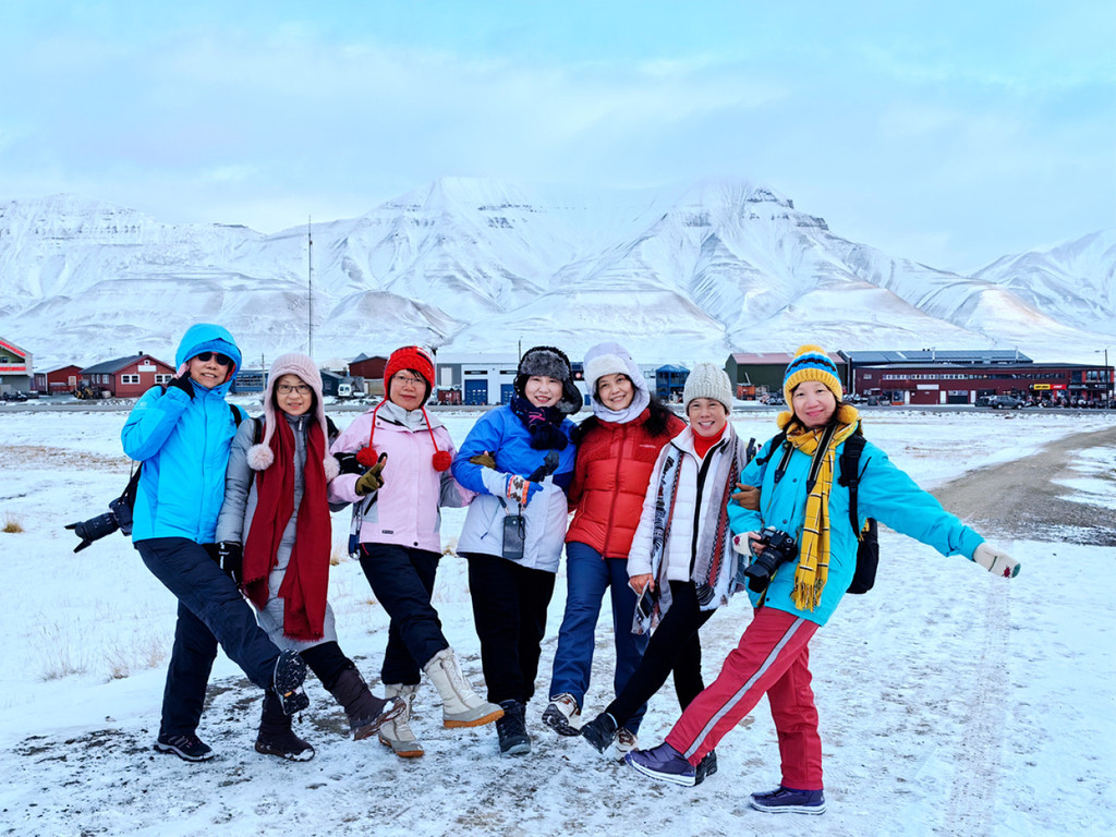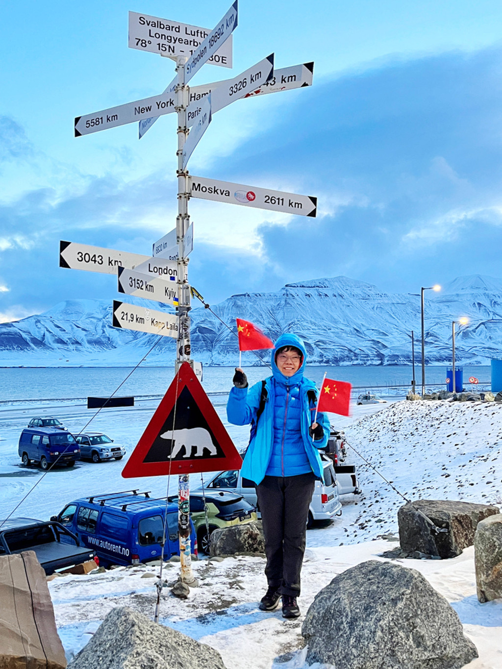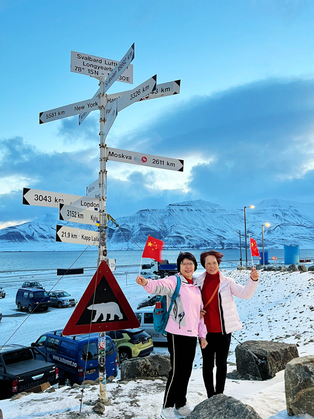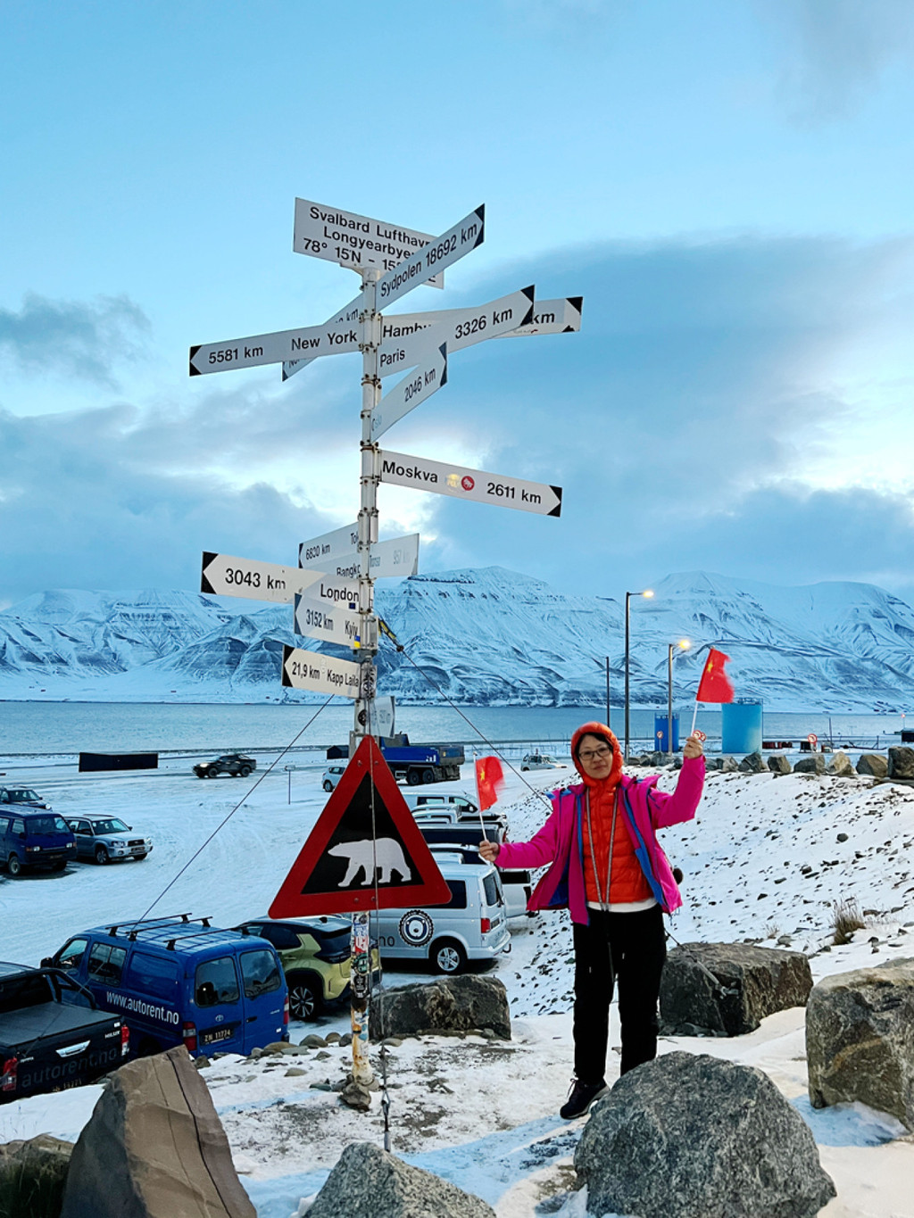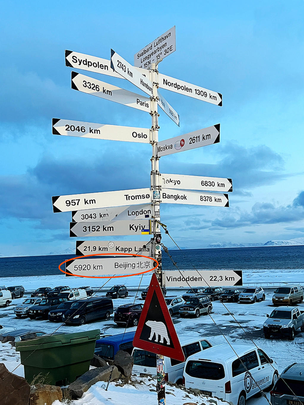 时间还早,机场外的那个地标再次吸引了我们,这次才清楚地看到地标上标示着 北京 5920公里。有心的团友阿冰特意从 广州 带来了小五星红旗,每个人都跑到路标下挥舞着国旗,在2023年10月1日这一天,我们在北纬78度,祝福祖国72岁生日,祝祖国繁 荣昌 盛!留下这难忘的一刻。