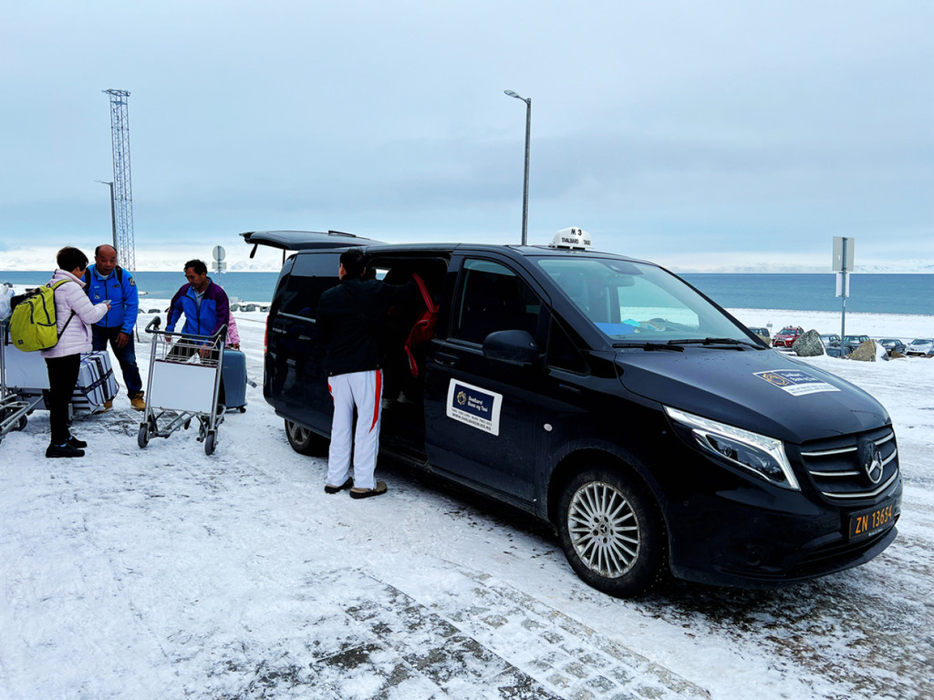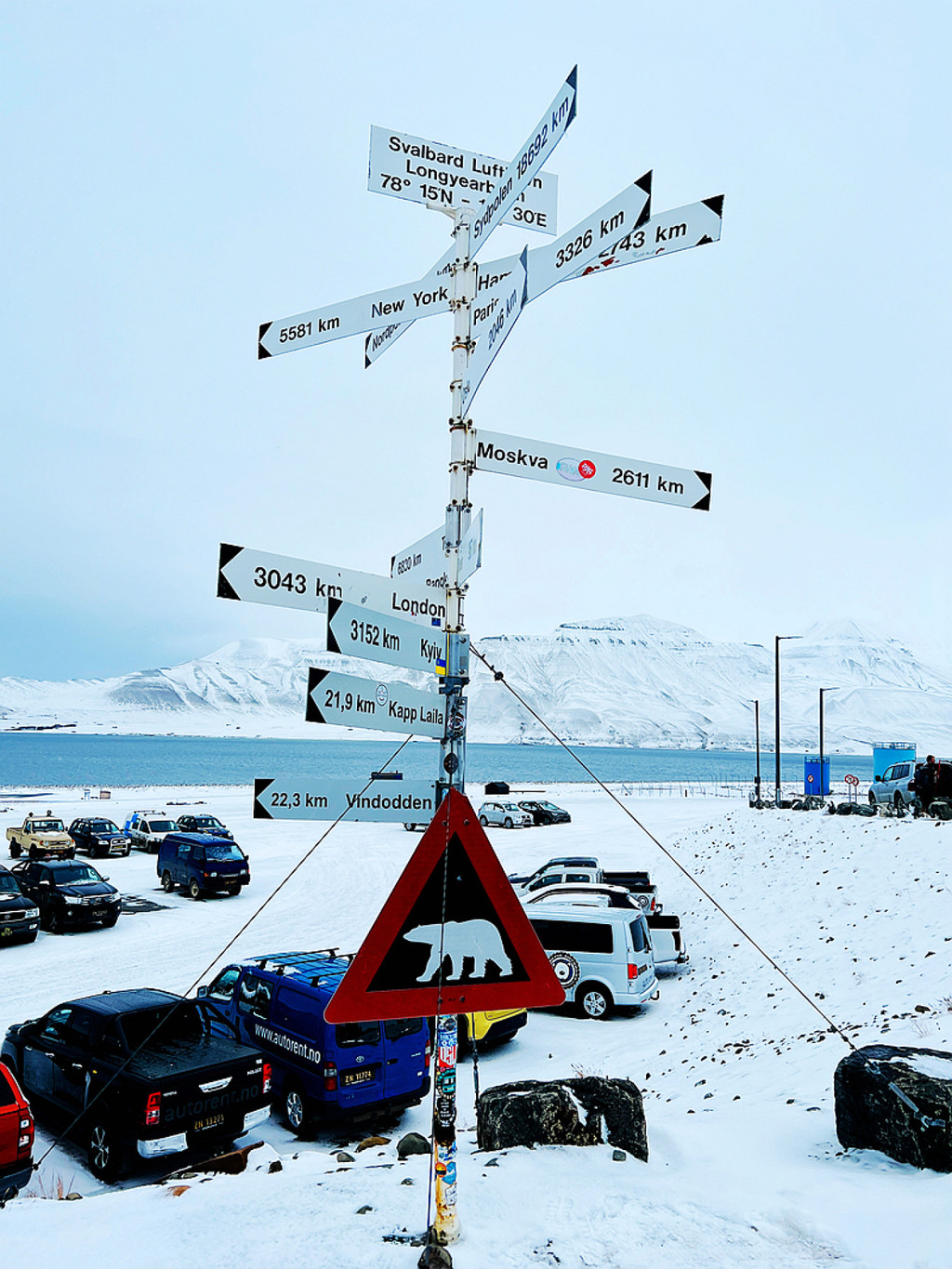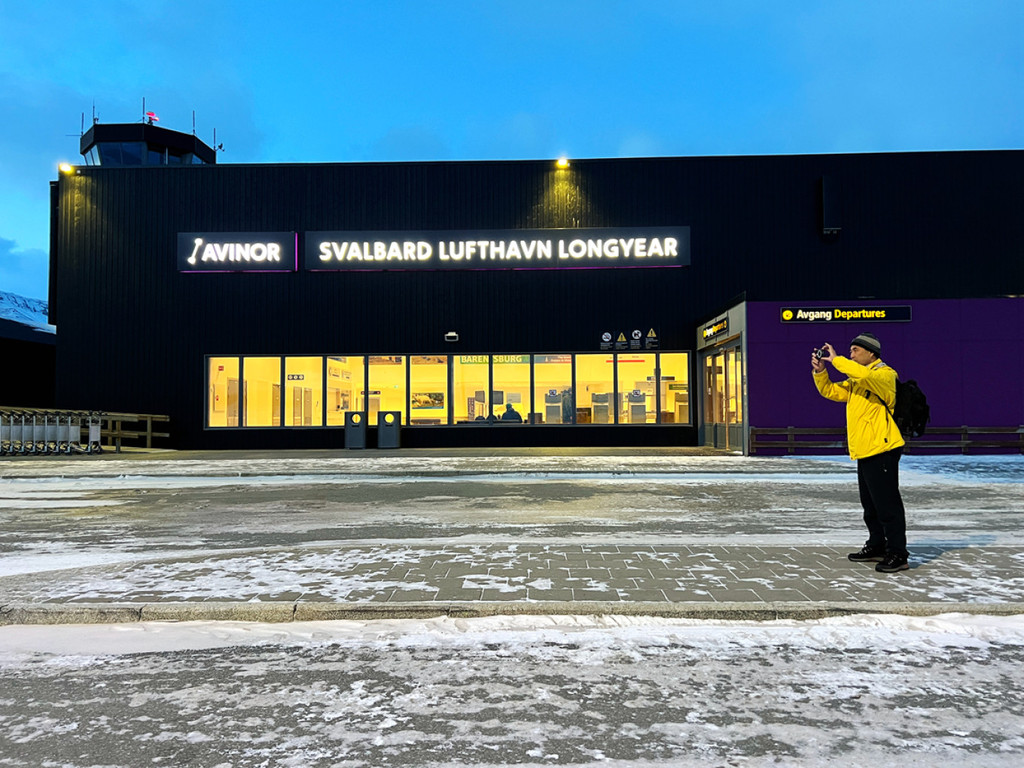 机场不大,就在海边,走出航站楼,一股冷风立刻灌入身体,这里完全是另一个世界另外一个天地。机场外有一个地标,上面清楚的标示着世界各地到此地的距离, 北京 到 朗伊尔城 5920公里(估计这是直线距离),成了我们的热门打卡地。