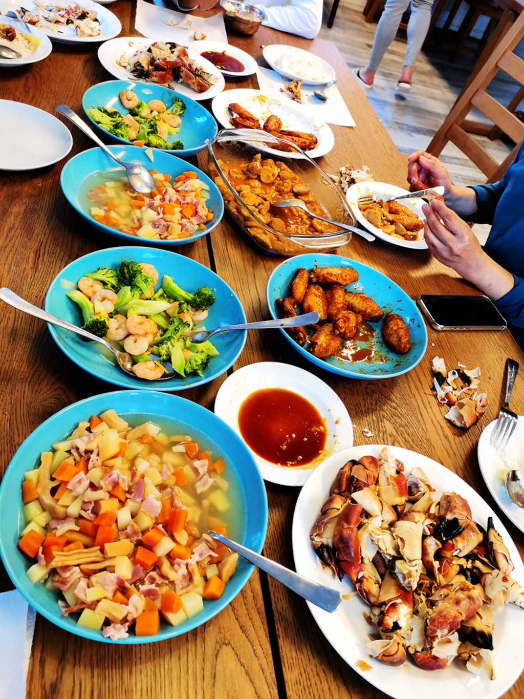 今天的晚餐同样丰富:三文鱼、咖喱土豆牛肉洋葱、青口、蛋炒饭、煎饺…,这是我们在 朗伊尔城 的最后一餐,不能对付。