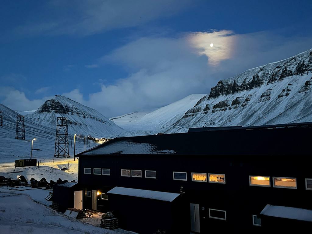 预约车到来之前走出暖和的房屋,凌厉的寒风并没有影响我们,仰望天空,天亮前微蓝的天空上,仍高挂着一轮月光,附近的山脉和地面的黑色小木屋,以及那些星星点点的路灯,很好地衬托出这片寒冷地区氛围。