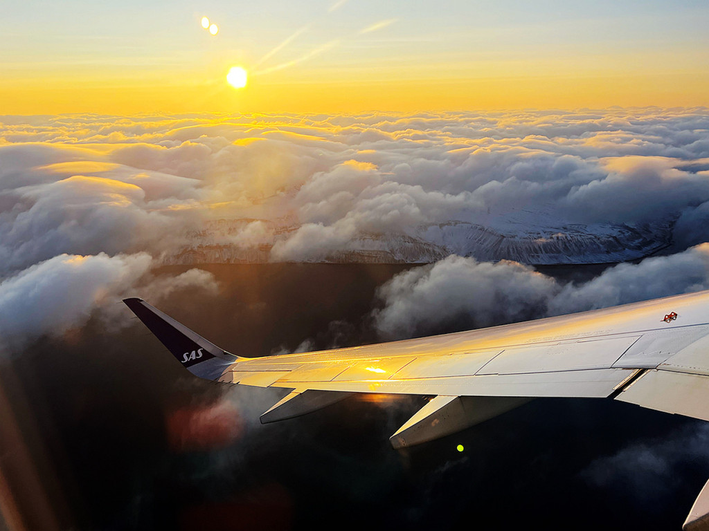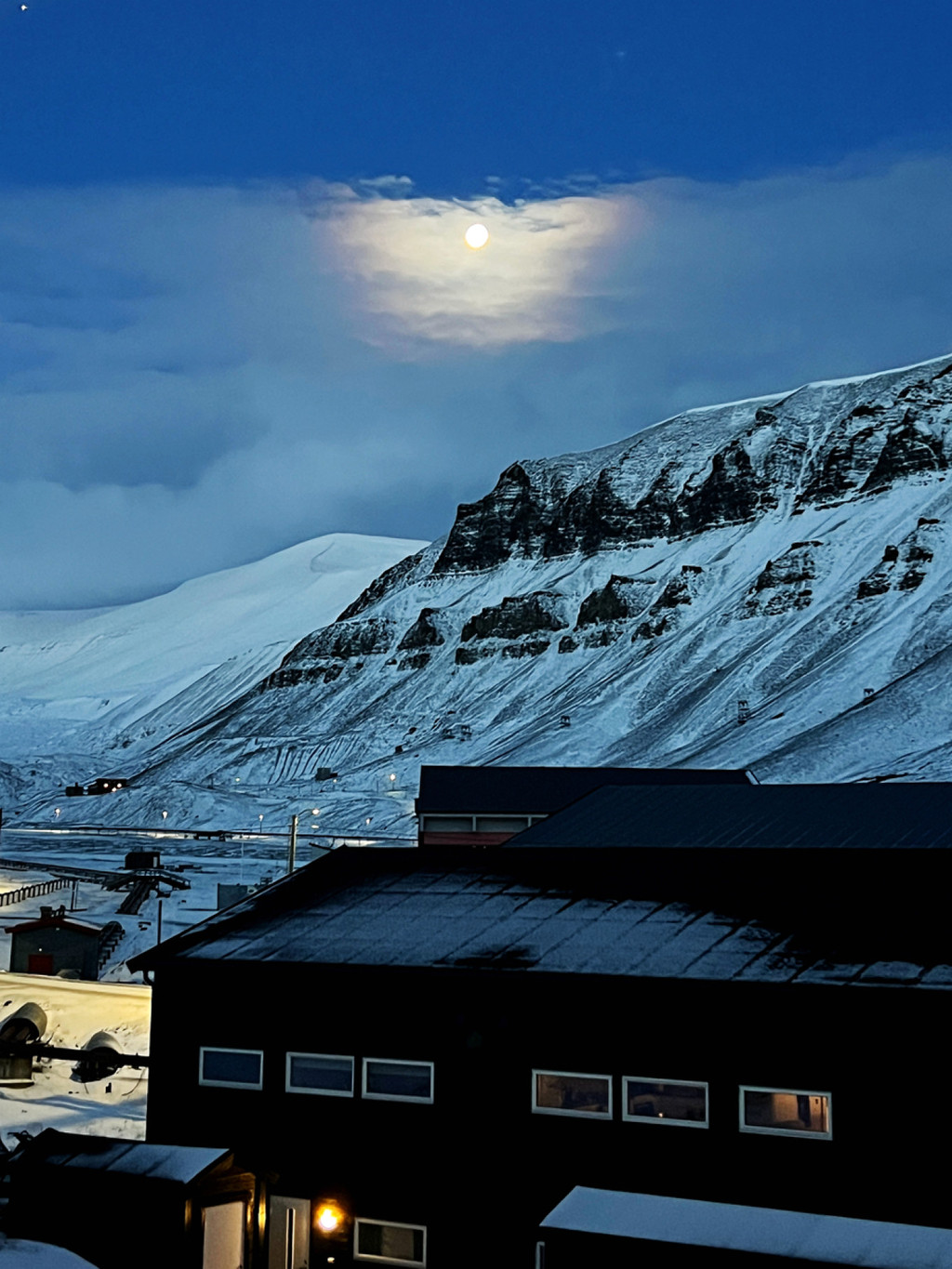 飞机起飞了,迎着初升的太阳缓缓飞离白雪皑皑的山脉,告别这座冰雪城市,这个世界最北城市,这个 北极 探险出发的城市。在天空中我们兴奋的发现飞机机翼与月亮同框,久久不愿离去。