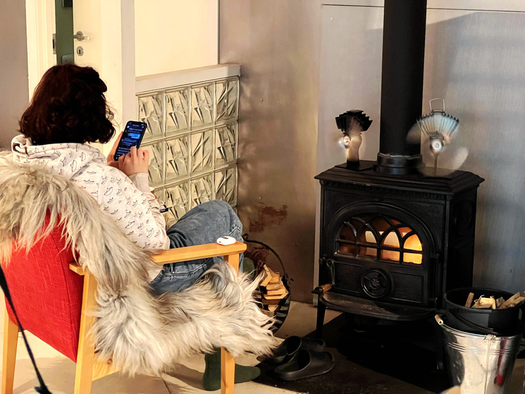 只有一名工作人员,舒服地坐在炉火前取暖玩手机。