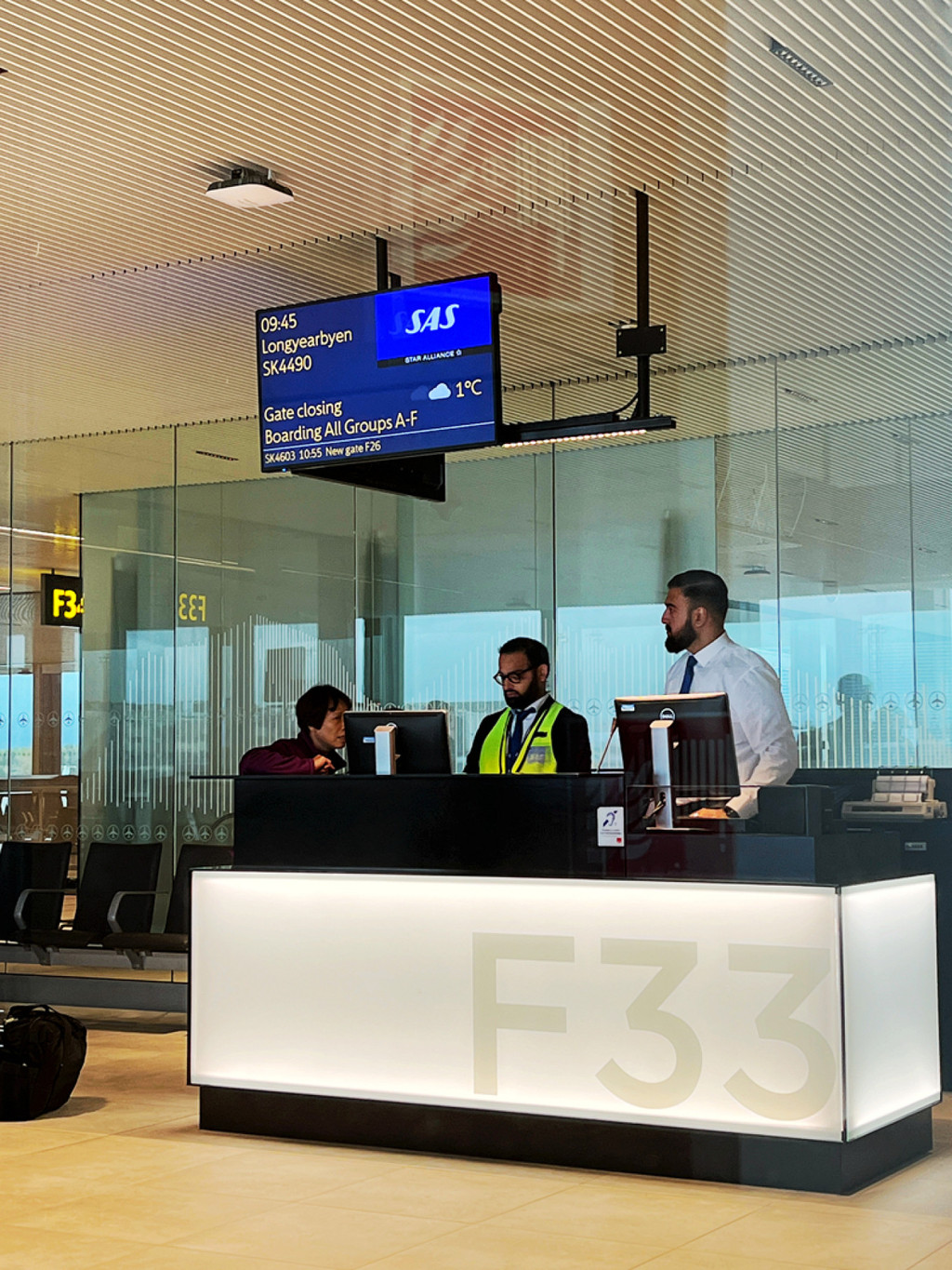 荷兰 小分队早餐后从酒店搭乘机场穿梭巴士来到机场,非常顺利地过关办理安检,提前来到登记口F33。另一队人则从 香港 飞 芬兰赫尔辛基 ,转机到 奥斯陆 再飞 朗伊尔城 (连飞三程,一口气飞到目的地)。