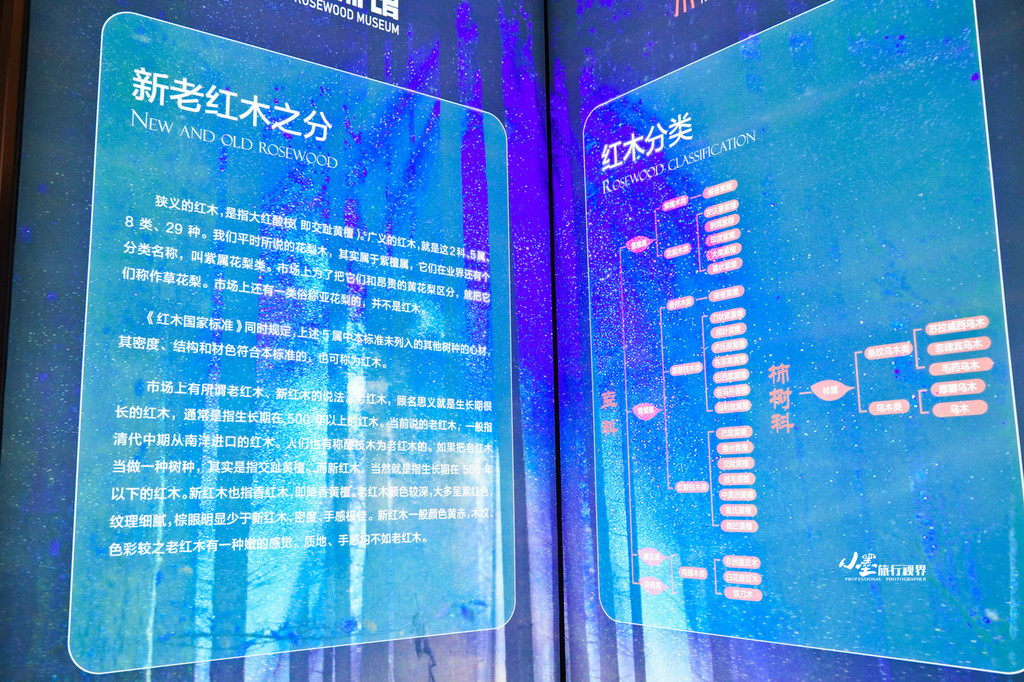 馆内详细介绍了红木的二科、五属、八类、二十九种的区分,刚才是社会学,现在才是正经的生物学分类。