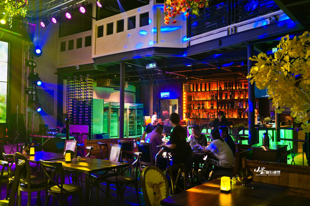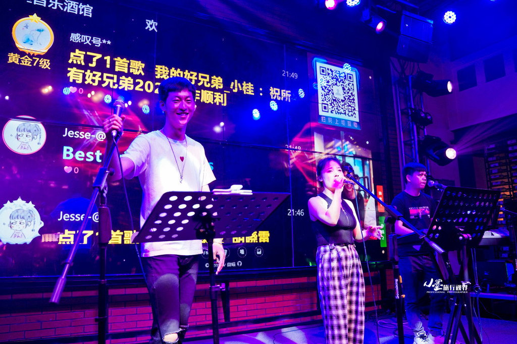 热闹的环境,动感的音乐,你还可以用手机扫码点歌,让驻唱乐队和全场观众一同徜徉在属于你的节奏里。