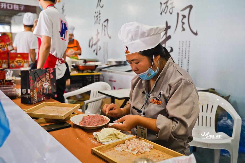 它的制作工序非常有意思,只见师傅右手飞快地舀起一勺掺了肉末的豆腐泥,轻轻碾压,放入左手装着葛粉的碗里,