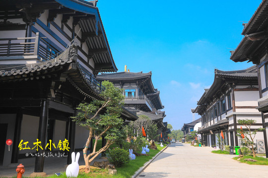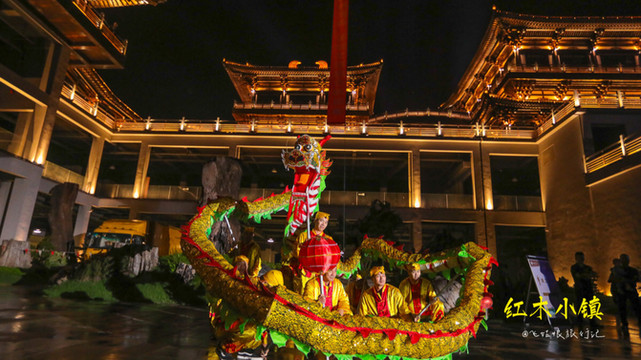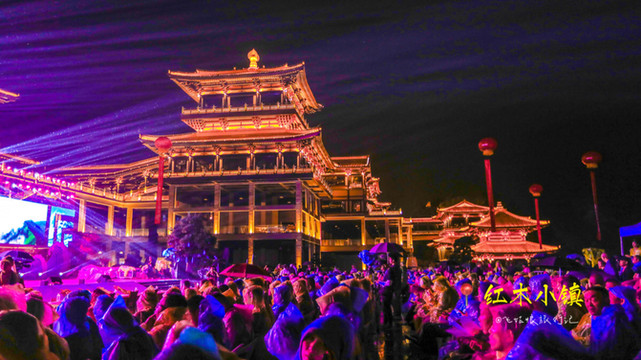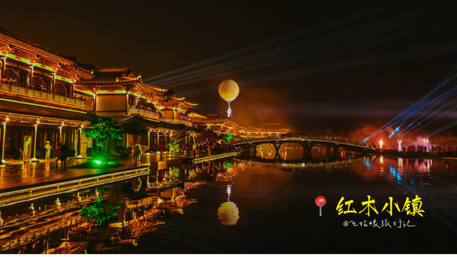 亮灯后的红木小镇,初看像 湖南 的 凤凰古城 ,再看像 西安 的大唐不夜城。