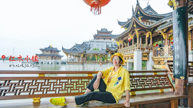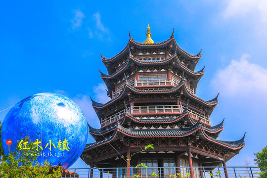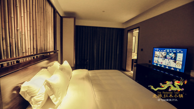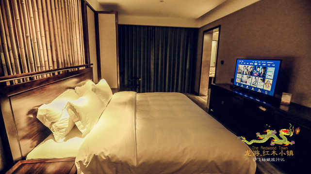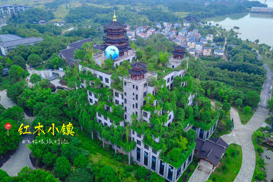 红木小镇2日游,当晚住宿在红木小镇里面的和合酒店,房间落地大窗的阳台正对着这栋长满绿植屋顶还有古塔的网红楼。客房景观极佳。