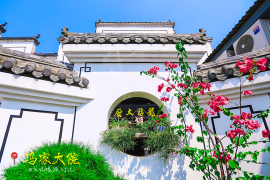 白墙黑瓦徽式建筑,院落里盆景盆栽绿意盎然