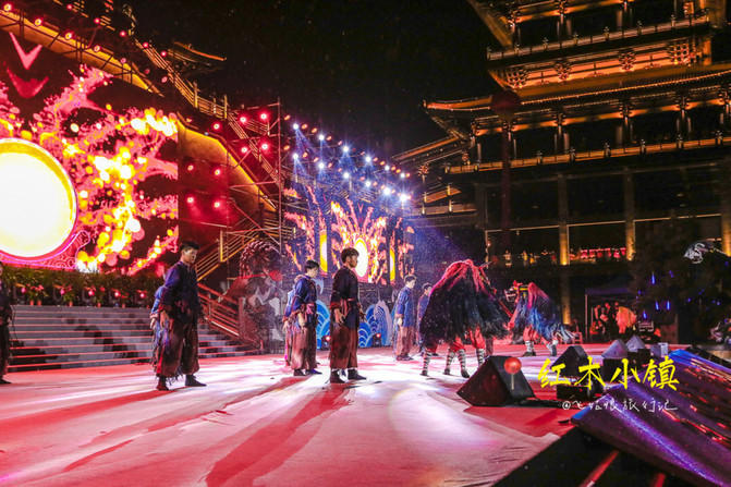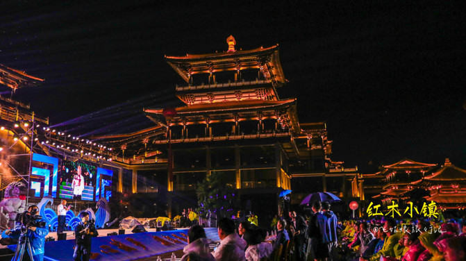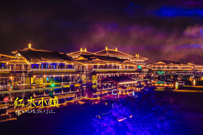 亮灯后的红木小镇,初看像 湖南 的 凤凰古城 ,再看像 西安 的大唐不夜城。