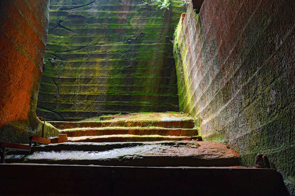 刚走到石窟门口,第一感觉就是凉意,盛夏时节,石窟外已经是三十七八度的高温,石窟内却至少低十度,很适合中午或者下午旅游,堪称城市里的“夏日避暑地”。顺着楼梯拾级而下,你一定会被眼前的风景所震撼,从已经开发的石窟来看,它们不仅工程浩大恢宏、最小的一号窟都有约300平方米,而且模式基本统一,每个石窟就是一座宏伟的大厅,呈倒斗矩形状,出口小下面大,一面陡峭,一面按约45度角倾斜,四壁笔直,棱角分明,甚至造型、格局、风格如出一手,在缺乏现代工具的古代实属难得,当然,光影之下也是拍照打卡的好去处。