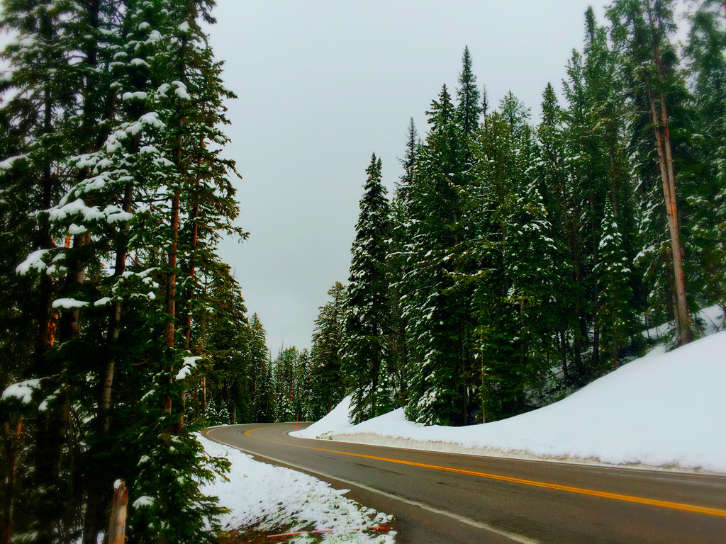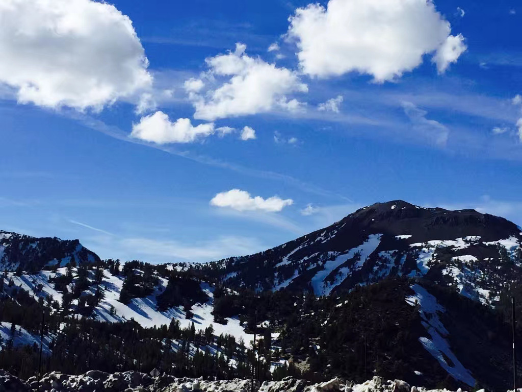 从里诺出发不久,车就拐上了被誉为“国家美景之路”的玫瑰山公路(Mt Rose Hwy), 这条山路极为曲折,从内华达州往太浩湖方向开,上坡非常陡。虽然道路两边风景优美,有雪山,有森林,但我们根本无暇顾及,只能认真开车,豆妈也一直叮嘱一定要慢。一路小心翼翼,终于爬到山顶,虽然山下是酷暑难耐,而山顶却还是白雪皑皑,我们停下车,缓缓神,放松放松。