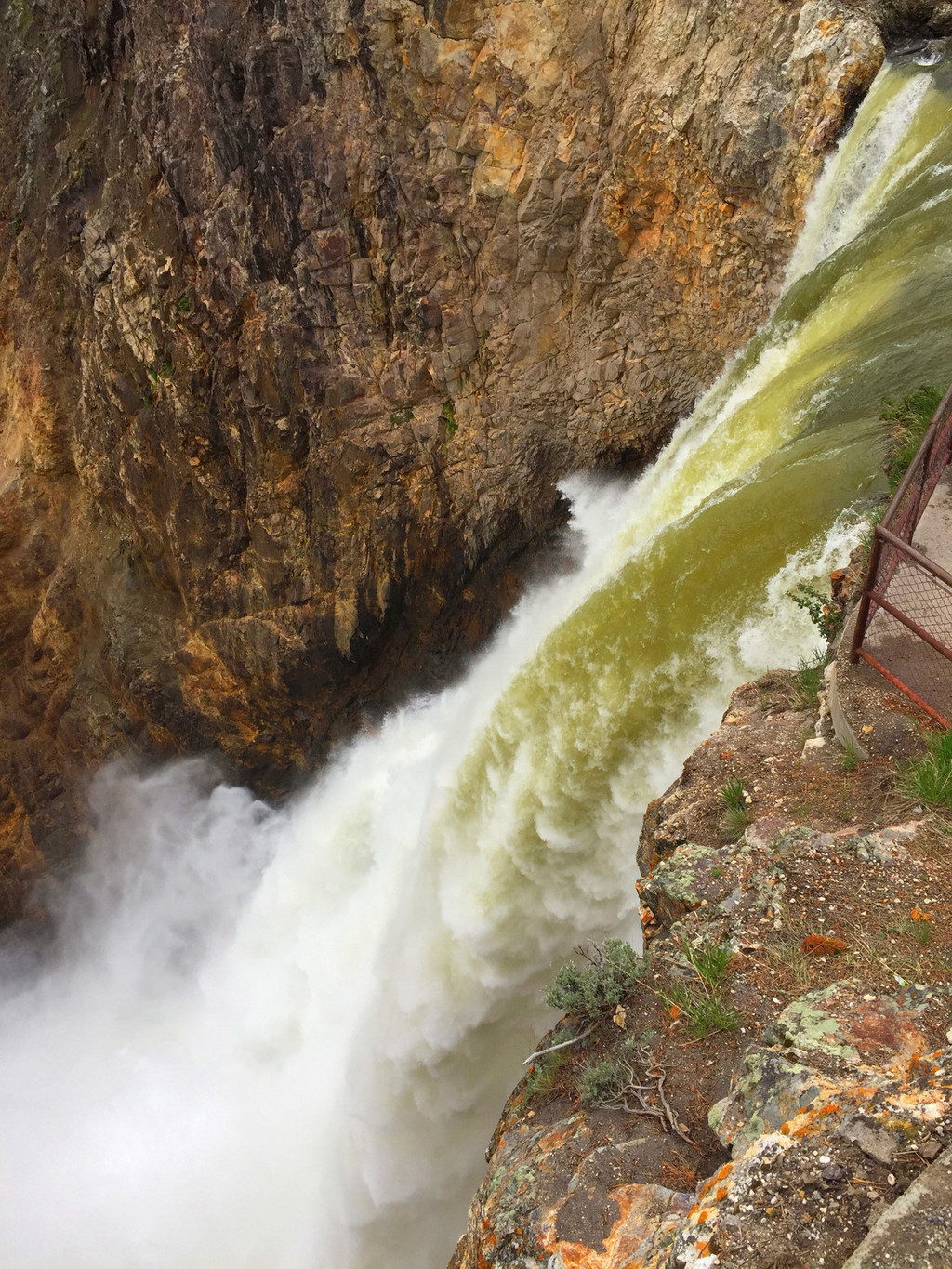 行驶了两个个多小时,我们来到黄石大峡谷,这是黄石公园最著名的景观之一,可以同时观赏壮观深邃的峡谷和飞流直下的瀑布,天气好,会看到一道彩虹横跨峡谷。黄石大峡谷有两个瀑布,Upper Fall上瀑布和Lower Fall下瀑布,下瀑布的落差更大,也更壮观,长期的河水冲刷形成了色彩瑰丽的岩壁,呈现出黄、橙、棕、褐等,印第安人称之为“黄石”。