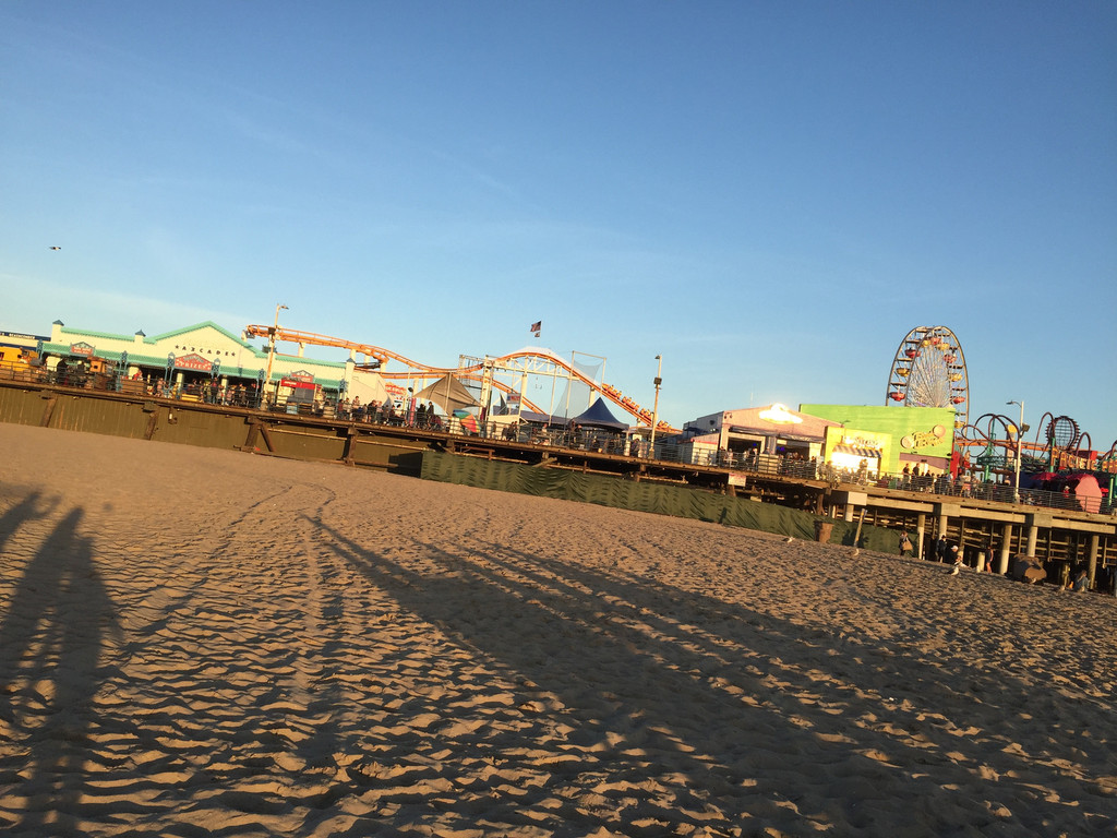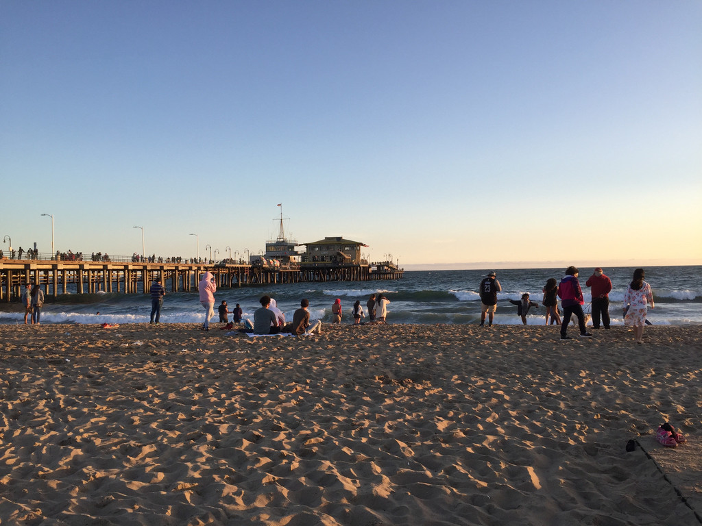 离开比弗利,我们来到今天最后一个游览点——圣莫尼卡海滩(Santa Monica Beach)。圣莫尼卡海滩是洛杉矶地区最有名最吸引游人的海滩之一,这里也是著名66号公路的终点,这里有一个突堤码头,可以说是"圣莫尼卡"的象征,不远处还有一个太平洋游乐园, 有很多美国的电影电视剧都曾在这里进行过拍摄。来到圣莫尼卡海滩时间已经是下午了,非常遗憾没有时间让荳妞去游乐园玩。我们一家三口只能在海滩上感受一下太平洋的寒风,欣赏海滩日落的美景。