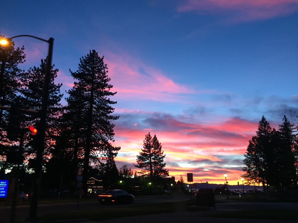 玩了一会,荳妞索性把鞋脱了,开始在湖边尽情地挥洒,一会儿玩沙,一会儿戏水;一会儿逗湖中的鸭子,一会儿往湖中丢石子......玩到太阳快要下山了,我们只好收拾东西,前往南太浩湖酒店。在前往酒店的途中,太浩湖的夕阳太美了,霞光万丈,紫霞漫天,豆妈的手机拍个不停。