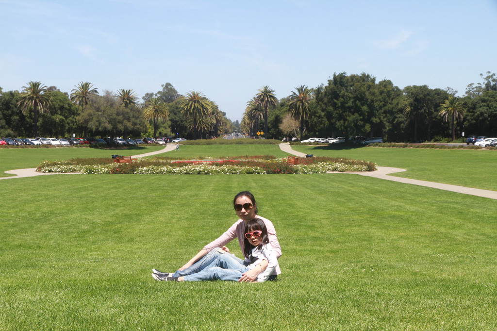 我们来到学校中心大广场(The Oval Park),广场好似铺了一层墨绿色地毯,广场两边各站着一排整齐的棕榈树,荳妞可高兴了,在草坪上跑来跑去。两个小时的游览很快就结束了,以至于没有上到胡佛塔一睹全校英姿。