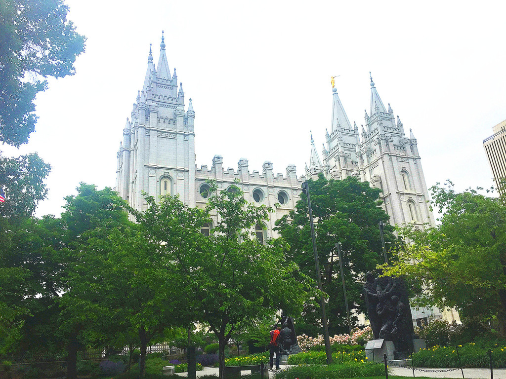 6月12日早上,我们到盐湖城著名景点——圣殿广场(Temple Square),整个广场安静庄严。圣殿广场坐落于盐湖城市中心,是犹他州盐湖城市中心一组属于摩门教总部的建筑群,包括魔门圣殿、盐湖城大礼拜堂、盐湖城聚会堂、海鸥纪念碑和两个游客中心,占地10英亩,周围有围墙环绕。