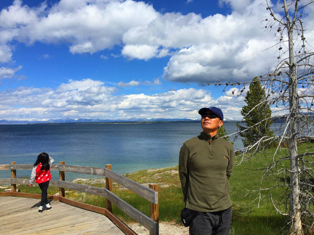 游览完老忠实喷泉,继续前行,来到黄石公园我们计划的最后一组景点——西拇指喷泉和黄石湖。西拇指喷泉和黄石湖位于公园东南边,湖中热泉是此处的特色,喷水口从湖底汩汩出水,暗黑、透明绿、宝石蓝,颜色丰富多彩,除了五颜六色的间歇泉,旁边的黄石湖和远处的雪山交相辉映,若天气晴好,更是难得的好风景。黄石湖如同大海般开阔,是“美国最大的高山湖泊”。湖水清澈透明,湖光山色,湖面与远处的雪山遥相呼应,极其秀丽!