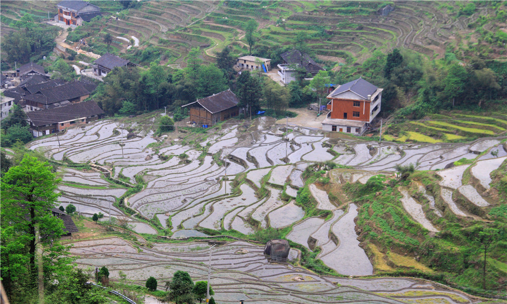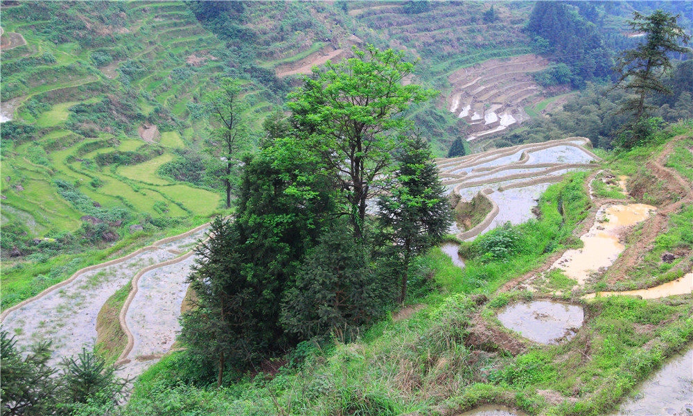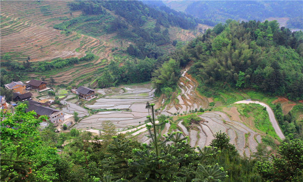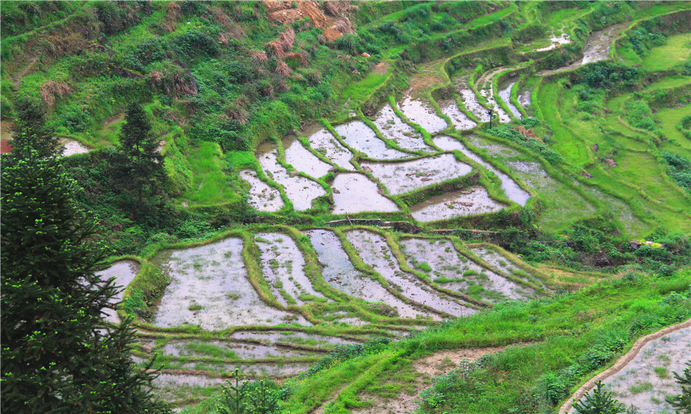 瑶人冲梯田景观由两条山脊一个凼,形成一个凹字,西端山梁,从山下一直延伸到山顶,多达200余级,似一座铁塔,梯田坡度都在25-50度之间。
