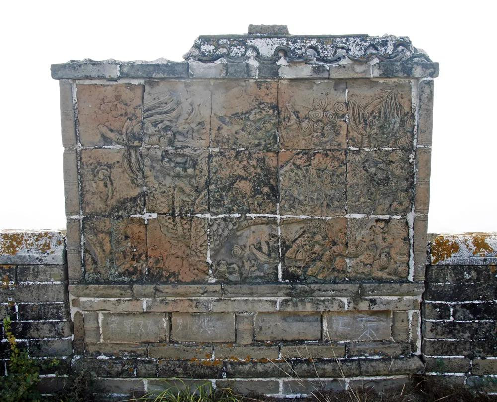 远近闻名的“麒麟影壁”就在小狐顶楼上层的南墙上。其影壁上有罩檐,下有底座,用青砖拼接而成,四周装饰浮雕图案。影壁的主体图案为麒麟回首望尾,奔跑于云朵之中,麒麟的鳞片清晰可见。麒麟头前饰灵芝,尾后雕由鹿一只。浮雕分为15个部分,分别模印烧制后拼接而成,制作精细,形象鲜明,气韵生动。