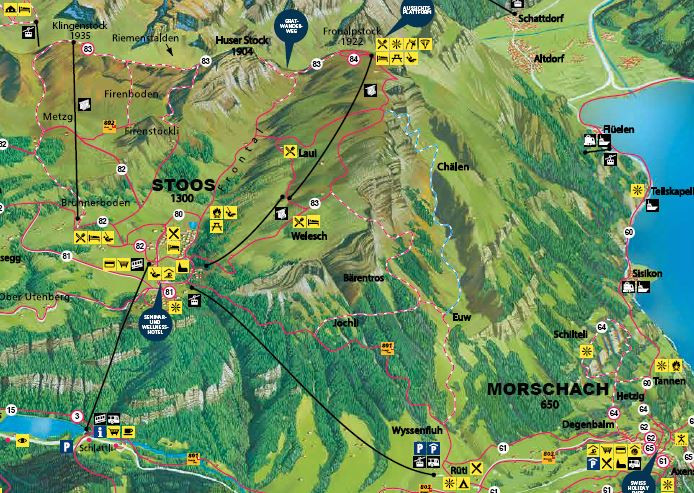 3- 折腾型全景徒步:从Stoos一路爬山,按照徒步指示牌的指引爬到Klingenstock山顶,然后走Stoos山脊徒步路线,最后在Fronalpstock坐缆车下山回到Stoos。此线路要攀登635米的海拔落差,适用于有体力的想挑战的吃饱了撑着的人。